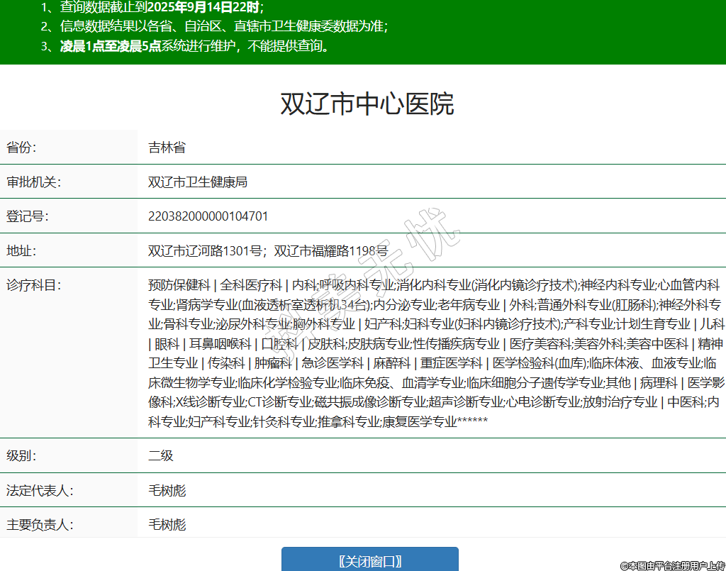 省份:吉林省審批機關(guān):雙遼市衛(wèi)生健康局登記號:220382000000104701地址:雙遼市遼河路1301號;雙遼市福耀路1198號診療科目:預(yù)防保健科 | 全科醫(yī)療科 | 內(nèi)科;呼吸內(nèi)科專業(yè);消化內(nèi)科專業(yè)(消化內(nèi)鏡診療技術(shù));神經(jīng)內(nèi)科專業(yè);心血管內(nèi)科專業(yè);腎病學專業(yè)(血液透析室透析機34臺);內(nèi)分泌專業(yè);老年病專業(yè) | 外科;普通外科專業(yè)(肛腸科);神經(jīng)外科專業(yè);骨科專業(yè);泌尿外科專業(yè);胸外科專業(yè) | 婦產(chǎn)科;婦科專業(yè)(婦科內(nèi)鏡診療技術(shù));產(chǎn)科專業(yè);計劃生育專業(yè) | 兒科 | 眼科 | 耳鼻咽喉科 | 口腔科 | 皮膚科;皮膚病專業(yè);性傳播疾病專業(yè) | 醫(yī)療美容科;美容外科;美容中醫(yī)科 | 精神衛(wèi)生專業(yè) | 傳染科 | 腫瘤科 | 急診醫(yī)學科 | 麻醉科 | 重癥醫(yī)學科 | 醫(yī)學檢驗科(血庫);臨床體液、血液專業(yè);臨床微生物學專業(yè);臨床化學檢驗專業(yè);臨床免疫、血清學專業(yè);臨床細胞分子遺傳學專業(yè);其他 | 病理科 | 醫(yī)學影像科;X線診斷專業(yè);CT診斷專業(yè);磁共振成像診斷專業(yè);超聲診斷專業(yè);心電診斷專業(yè);放射治療專業(yè) | 中醫(yī)科;內(nèi)科專業(yè);婦產(chǎn)科專業(yè);針灸科專業(yè);推拿科專業(yè);康復(fù)醫(yī)學專業(yè)******級別:二級法定代表人:毛樹彪主要負責人:毛樹彪執(zhí)業(yè)許可證有效期:2023/06/09 -至- 2026/06/09 -