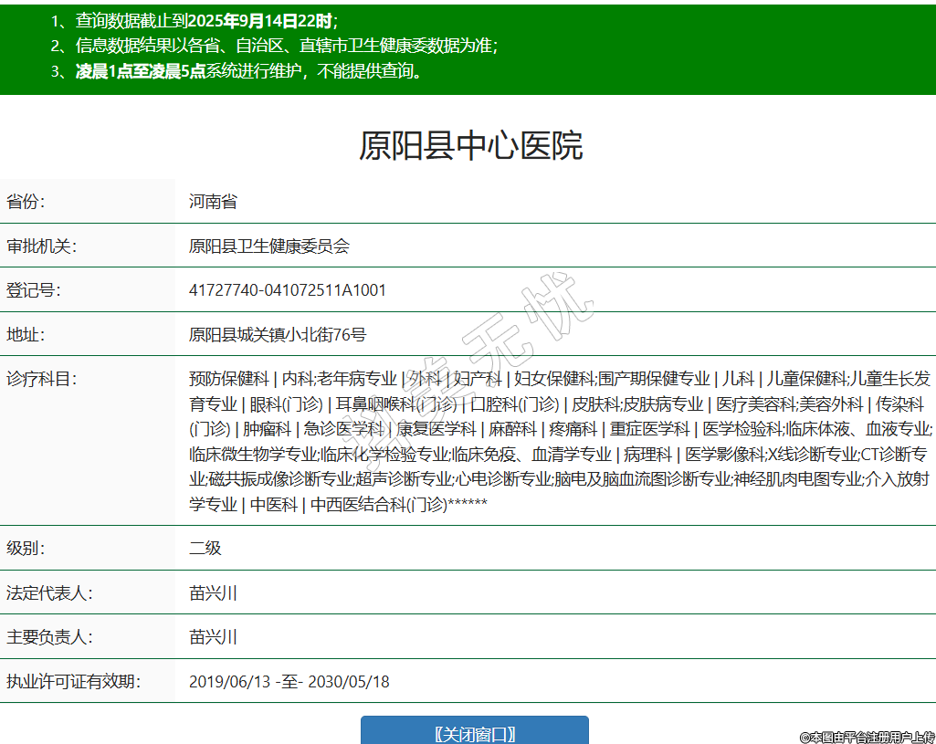 省份:河南省審批機關:原陽縣衛(wèi)生健康委員會登記號:41727740-041072511A1001地址:原陽縣城關鎮(zhèn)小北街76號診療科目:預防保健科 | 內科;老年病專業(yè) | 外科 | 婦產科 | 婦女保健科;圍產期保健專業(yè) | 兒科 | 兒童保健科;兒童生長發(fā)育專業(yè) | 眼科(門診) | 耳鼻咽喉科(門診) | 口腔科(門診) | 皮膚科;皮膚病專業(yè) | 醫(yī)療美容科;美容外科 | 傳染科(門診) | 腫瘤科 | 急診醫(yī)學科 | 康復醫(yī)學科 | 麻醉科 | 疼痛科 | 重癥醫(yī)學科 | 醫(yī)學檢驗科;臨床體液、血液專業(yè);臨床微生物學專業(yè);臨床化學檢驗專業(yè);臨床免疫、血清學專業(yè) | 病理科 | 醫(yī)學影像科;X線診斷專業(yè);CT診斷專業(yè);磁共振成像診斷專業(yè);超聲診斷專業(yè);心電診斷專業(yè);腦電及腦血流圖診斷專業(yè);神經肌肉電圖專業(yè);介入放射學專業(yè) | 中醫(yī)科 | 中西醫(yī)結合科(門診)******級別:二級法定代表人:苗興川主要負責人:苗興川執(zhí)業(yè)許可證有效期:2019/06/13 -至- 2030/05/18 -