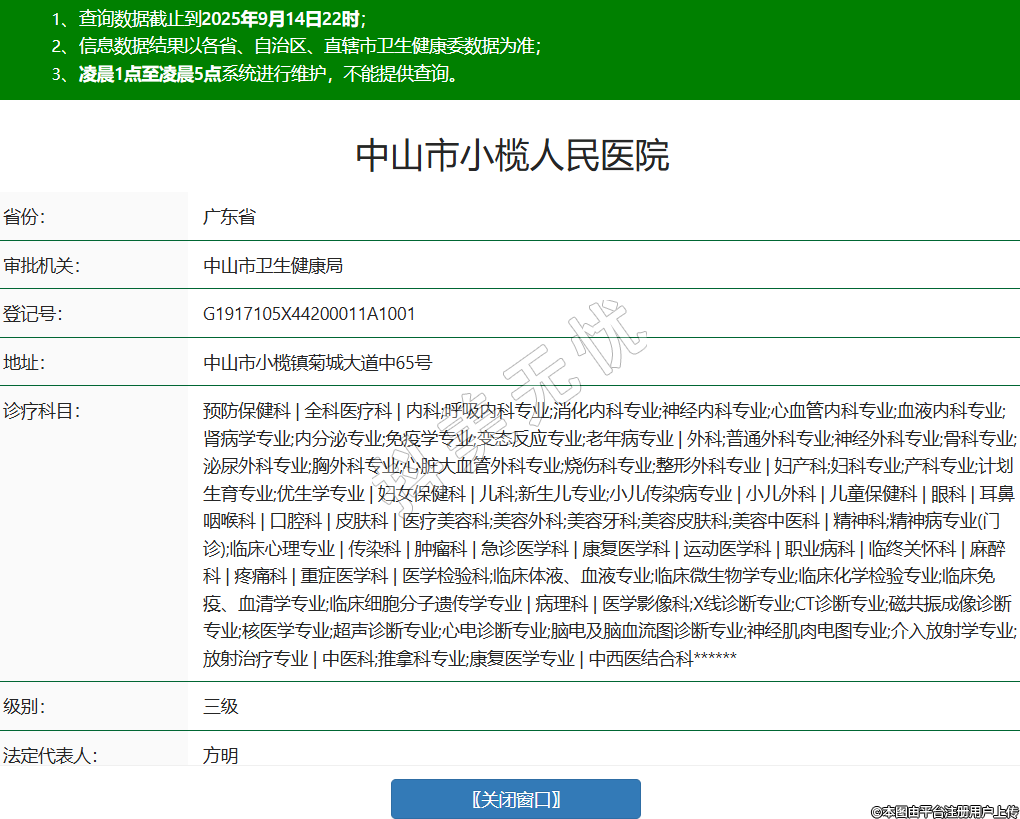 省份:廣東省審批機(jī)關(guān):中山市衛(wèi)生健康局登記號:G1917105X44200011A1001地址:中山市小欖鎮(zhèn)菊城大道中65號診療科目:預(yù)防保健科 | 全科醫(yī)療科 | 內(nèi)科;呼吸內(nèi)科專業(yè);消化內(nèi)科專業(yè);神經(jīng)內(nèi)科專業(yè);心血管內(nèi)科專業(yè);血液內(nèi)科專業(yè);腎病學(xué)專業(yè);內(nèi)分泌專業(yè);免疫學(xué)專業(yè);變態(tài)反應(yīng)專業(yè);老年病專業(yè) | 外科;普通外科專業(yè);神經(jīng)外科專業(yè);骨科專業(yè);泌尿外科專業(yè);胸外科專業(yè);心臟大血管外科專業(yè);燒傷科專業(yè);整形外科專業(yè) | 婦產(chǎn)科;婦科專業(yè);產(chǎn)科專業(yè);計劃生育專業(yè);優(yōu)生學(xué)專業(yè) | 婦女保健科 | 兒科;新生兒專業(yè);小兒傳染病專業(yè) | 小兒外科 | 兒童保健科 | 眼科 | 耳鼻咽喉科 | 口腔科 | 皮膚科 | 醫(yī)療美容科;美容外科;美容牙科;美容皮膚科;美容中醫(yī)科 | 精神科;精神病專業(yè)(門診);臨床心理專業(yè) | 傳染科 | 腫瘤科 | 急診醫(yī)學(xué)科 | 康復(fù)醫(yī)學(xué)科 | 運(yùn)動醫(yī)學(xué)科 | 職業(yè)病科 | 臨終關(guān)懷科 | 麻醉科 | 疼痛科 | 重癥醫(yī)學(xué)科 | 醫(yī)學(xué)檢驗科;臨床體液、血液專業(yè);臨床微生物學(xué)專業(yè);臨床化學(xué)檢驗專業(yè);臨床免疫、血清學(xué)專業(yè);臨床細(xì)胞分子遺傳學(xué)專業(yè) | 病理科 | 醫(yī)學(xué)影像科;X線診斷專業(yè);CT診斷專業(yè);磁共振成像診斷專業(yè);核醫(yī)學(xué)專業(yè);超聲診斷專業(yè);心電診斷專業(yè);腦電及腦血流圖診斷專業(yè);神經(jīng)肌肉電圖專業(yè);介入放射學(xué)專業(yè);放射治療專業(yè) | 中醫(yī)科;推拿科專業(yè);康復(fù)醫(yī)學(xué)專業(yè) | 中西醫(yī)結(jié)合科******級別:三級法定代表人:方明主要負(fù)責(zé)人:方明執(zhí)業(yè)許可證有效期:2024/08/02 -至- 2025/10/26 -