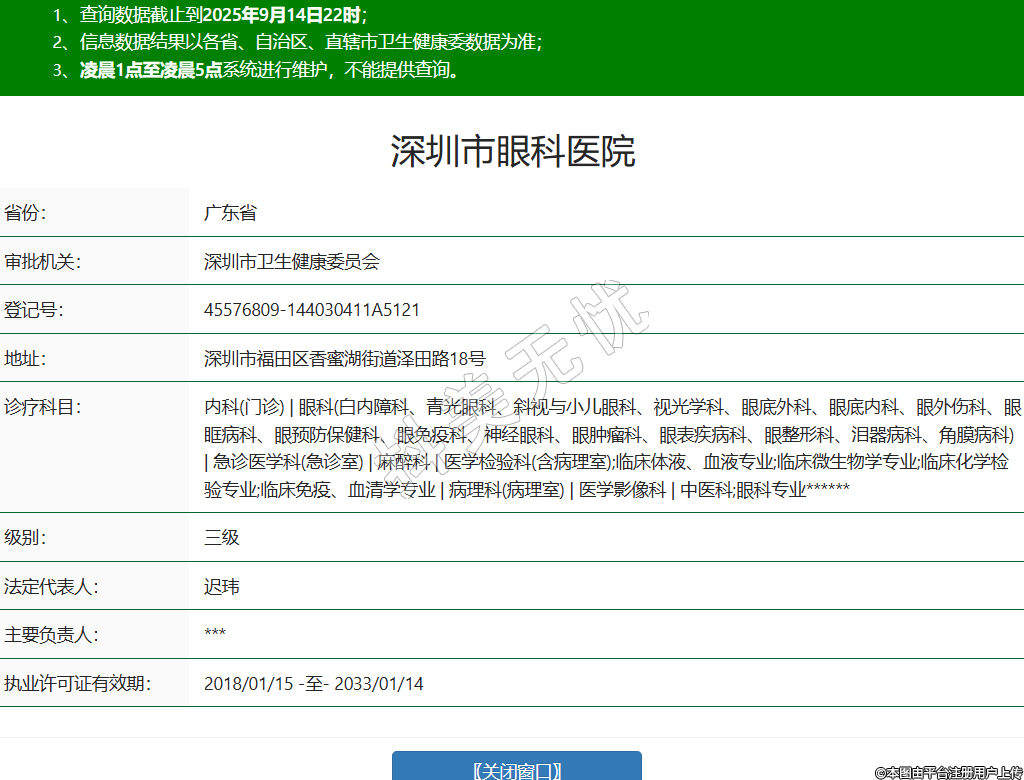 省份:廣東省審批機(jī)關(guān):深圳市衛(wèi)生健康委員會登記號:45576809-144030411A5121地址:深圳市福田區(qū)香蜜湖街道澤田路18號診療科目:內(nèi)科(門診) | 眼科(白內(nèi)障科、青光眼科、斜視與小兒眼科、視光學(xué)科、眼底外科、眼底內(nèi)科、眼外傷科、眼眶病科、眼預(yù)防保健科、眼免疫科、神經(jīng)眼科、眼腫瘤科、眼表疾病科、眼整形科、淚器病科、角膜病科) | 急診醫(yī)學(xué)科(急診室) | 麻醉科 | 醫(yī)學(xué)檢驗科(含病理室);臨床體液、血液專業(yè);臨床微生物學(xué)專業(yè);臨床化學(xué)檢驗專業(yè);臨床免疫、血清學(xué)專業(yè) | 病理科(病理室) | 醫(yī)學(xué)影像科 | 中醫(yī)科;眼科專業(yè)******級別:三級法定代表人:遲瑋主要負(fù)責(zé)人:***執(zhí)業(yè)許可證有效期:2018/01/15 -至- 2033/01/14 -