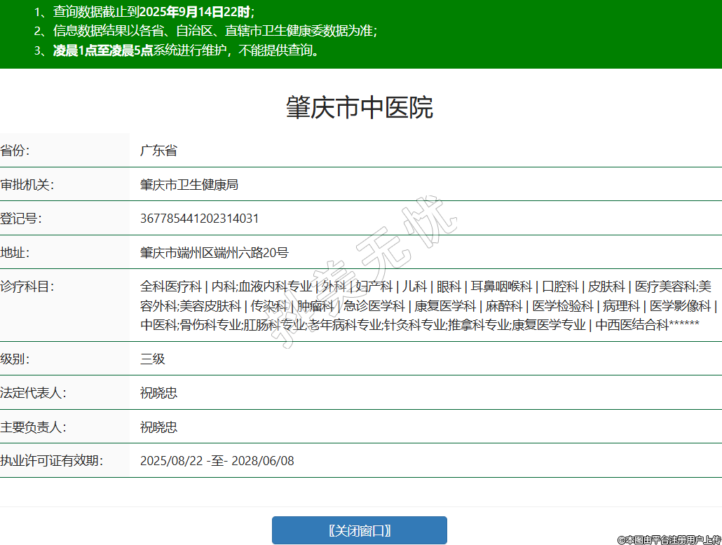 省份:廣東省審批機(jī)關(guān):肇慶市衛(wèi)生健康局登記號(hào):367785441202314031地址:肇慶市端州區(qū)端州六路20號(hào)診療科目:全科醫(yī)療科 | 內(nèi)科;血液內(nèi)科專業(yè) | 外科 | 婦產(chǎn)科 | 兒科 | 眼科 | 耳鼻咽喉科 | 口腔科 | 皮膚科 | 醫(yī)療美容科;美容外科;美容皮膚科 | 傳染科 | 腫瘤科 | 急診醫(yī)學(xué)科 | 康復(fù)醫(yī)學(xué)科 | 麻醉科 | 醫(yī)學(xué)檢驗(yàn)科 | 病理科 | 醫(yī)學(xué)影像科 | 中醫(yī)科;骨傷科專業(yè);肛腸科專業(yè);老年病科專業(yè);針灸科專業(yè);推拿科專業(yè);康復(fù)醫(yī)學(xué)專業(yè) | 中西醫(yī)結(jié)合科******級(jí)別:三級(jí)法定代表人:祝曉忠主要負(fù)責(zé)人:祝曉忠執(zhí)業(yè)許可證有效期:2025/08/22 -至- 2028/06/08 -