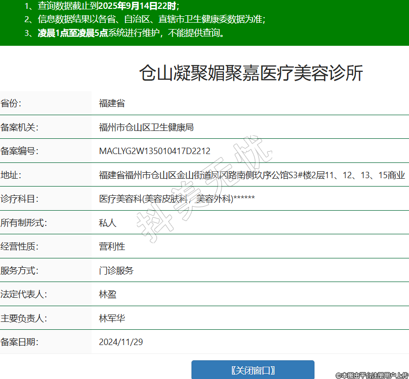 省份:福建省備案機關(guān):福州市倉山區(qū)衛(wèi)生健康局備案編號:MACLYG2W135010417D2212地址:福建省福州市倉山區(qū)金山街道鳳岡路南側(cè)玖序公館S3#樓2層11、12、13、15商業(yè)診療科目:醫(yī)療美容科(美容皮膚科,美容外科)******所有制形式:私人經(jīng)營性質(zhì):營利性服務(wù)方式:門診服務(wù)法定代表人:林盈主要負(fù)責(zé)人:林軍華備案日期:2024/11/29 -