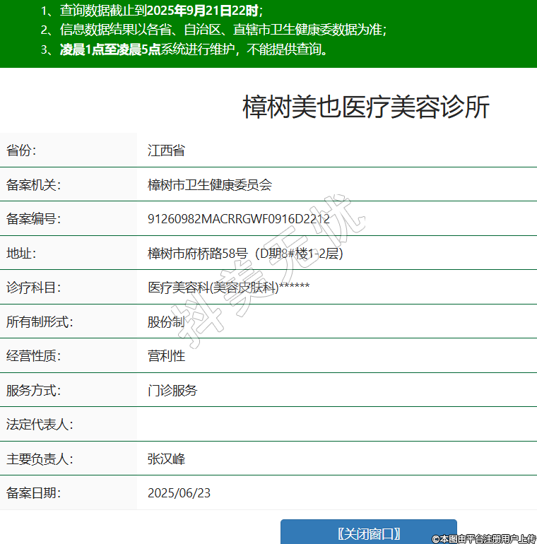 省份:江西省備案機(jī)關(guān):樟樹市衛(wèi)生健康委員會(huì)備案編號(hào):91260982MACRRGWF0916D2212地址:樟樹市府橋路58號(hào)(D期8#樓1-2層)診療科目:醫(yī)療美容科(美容皮膚科)******所有制形式:股份制經(jīng)營(yíng)性質(zhì):營(yíng)利性服務(wù)方式:門診服務(wù)法定代表人:主要負(fù)責(zé)人:張漢峰備案日期:2025/06/23 -