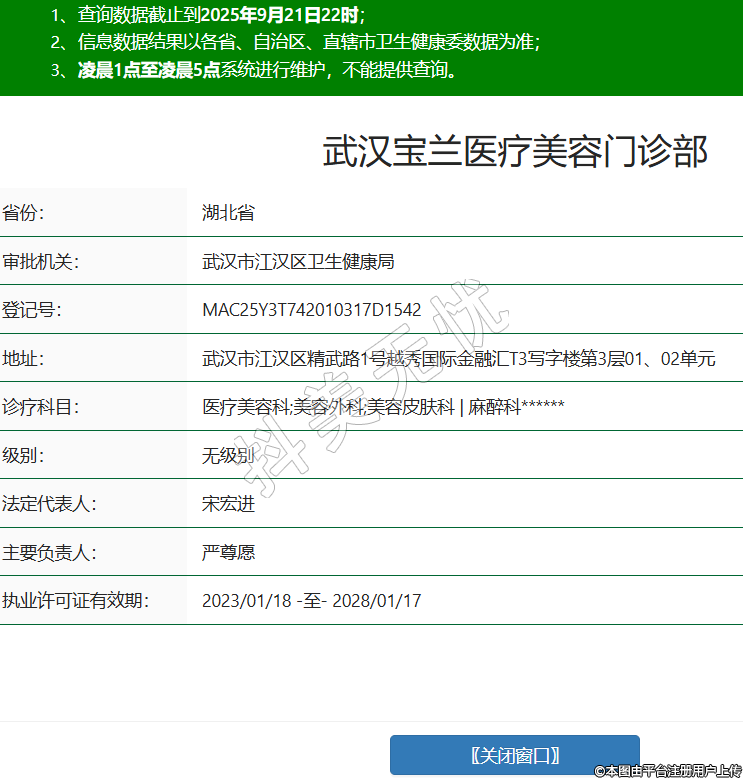 省份:湖北省審批機(jī)關(guān):武漢市江漢區(qū)衛(wèi)生健康局登記號(hào):MAC25Y3T742010317D1542地址:武漢市江漢區(qū)精武路1號(hào)越秀國(guó)際金融匯T3寫字樓第3層01、02單元診療科目:醫(yī)療美容科;美容外科;美容皮膚科 | 麻醉科******級(jí)別:無(wú)級(jí)別法定代表人:宋宏進(jìn)主要負(fù)責(zé)人:嚴(yán)尊愿執(zhí)業(yè)許可證有效期:2023/01/18 -至- 2028/01/17 -