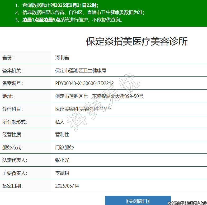 省份:河北省備案機(jī)關(guān):保定市蓮池區(qū)衛(wèi)生健康局備案編號(hào):PDY00343-X13060617D2212地址:保定市蓮池區(qū)七一東路錦湖北大街399-50號(hào)診療科目:醫(yī)療美容科(美容外科)******所有制形式:私人經(jīng)營(yíng)性質(zhì):營(yíng)利性服務(wù)方式:門診服務(wù)法定代表人:張小光主要負(fù)責(zé)人:李晨耕備案日期:2025/05/14 -