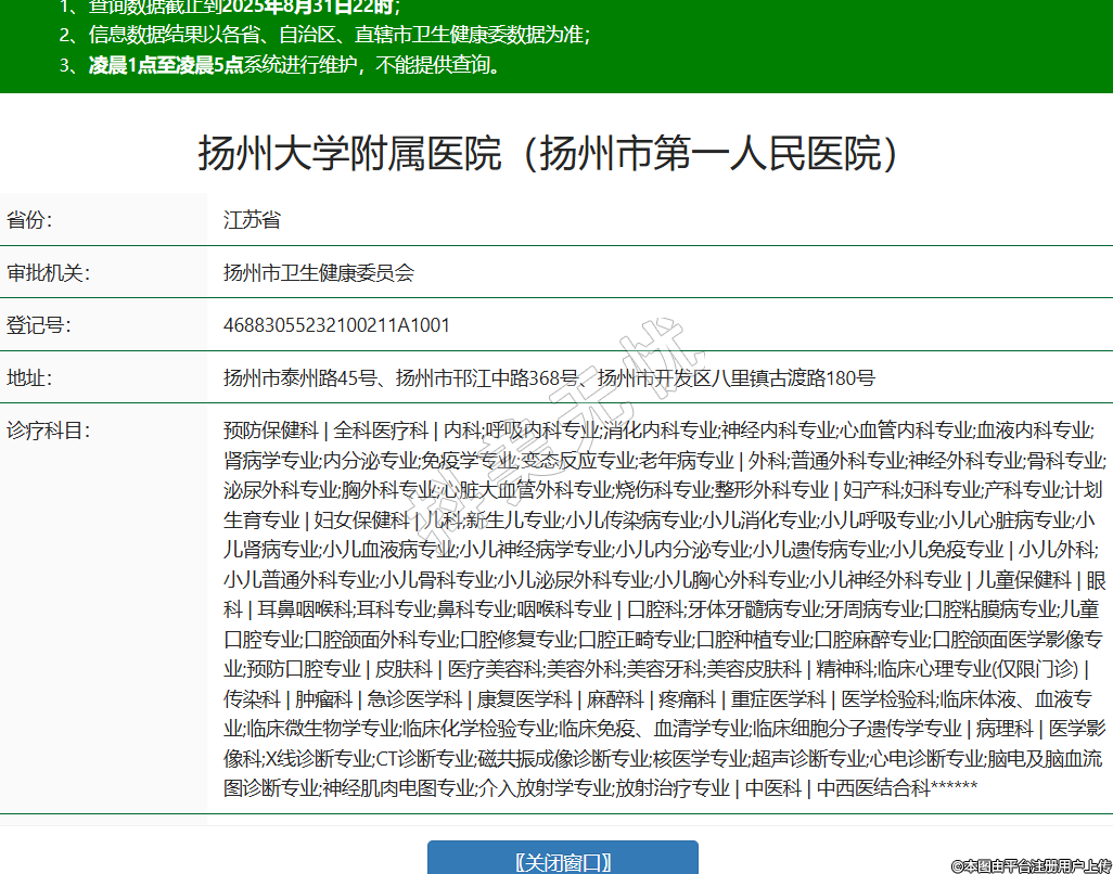 省份:江蘇省審批機(jī)關(guān):揚(yáng)州市衛(wèi)生健康委員會(huì)登記號:46883055232100211A1001地址:揚(yáng)州市泰州路45號、揚(yáng)州市邗江中路368號、揚(yáng)州市開發(fā)區(qū)八里鎮(zhèn)古渡路180號診療科目:預(yù)防保健科 | 全科醫(yī)療科 | 內(nèi)科;呼吸內(nèi)科專業(yè);消化內(nèi)科專業(yè);神經(jīng)內(nèi)科專業(yè);心血管內(nèi)科專業(yè);血液內(nèi)科專業(yè);腎病學(xué)專業(yè);內(nèi)分泌專業(yè);免疫學(xué)專業(yè);變態(tài)反應(yīng)專業(yè);老年病專業(yè) | 外科;普通外科專業(yè);神經(jīng)外科專業(yè);骨科專業(yè);泌尿外科專業(yè);胸外科專業(yè);心臟大血管外科專業(yè);燒傷科專業(yè);整形外科專業(yè) | 婦產(chǎn)科;婦科專業(yè);產(chǎn)科專業(yè);計(jì)劃生育專業(yè) | 婦女保健科 | 兒科;新生兒專業(yè);小兒傳染病專業(yè);小兒消化專業(yè);小兒呼吸專業(yè);小兒心臟病專業(yè);小兒腎病專業(yè);小兒血液病專業(yè);小兒神經(jīng)病學(xué)專業(yè);小兒內(nèi)分泌專業(yè);小兒遺傳病專業(yè);小兒免疫專業(yè) | 小兒外科;小兒普通外科專業(yè);小兒骨科專業(yè);小兒泌尿外科專業(yè);小兒胸心外科專業(yè);小兒神經(jīng)外科專業(yè) | 兒童保健科 | 眼科 | 耳鼻咽喉科;耳科專業(yè);鼻科專業(yè);咽喉科專業(yè) | 口腔科;牙體牙髓病專業(yè);牙周病專業(yè);口腔粘膜病專業(yè);兒童口腔專業(yè);口腔頜面外科專業(yè);口腔修復(fù)專業(yè);口腔正畸專業(yè);口腔種植專業(yè);口腔麻醉專業(yè);口腔頜面醫(yī)學(xué)影像專業(yè);預(yù)防口腔專業(yè) | 皮膚科 | 醫(yī)療美容科;美容外科;美容牙科;美容皮膚科 | 精神科;臨床心理專業(yè)(僅限門診) | 傳染科 | 腫瘤科 | 急診醫(yī)學(xué)科 | 康復(fù)醫(yī)學(xué)科 | 麻醉科 | 疼痛科 | 重癥醫(yī)學(xué)科 | 醫(yī)學(xué)檢驗(yàn)科;臨床體液、血液專業(yè);臨床微生物學(xué)專業(yè);臨床化學(xué)檢驗(yàn)專業(yè);臨床免疫、血清學(xué)專業(yè);臨床細(xì)胞分子遺傳學(xué)專業(yè) | 病理科 | 醫(yī)學(xué)影像科;X線診斷專業(yè);CT診斷專業(yè);磁共振成像診斷專業(yè);核醫(yī)學(xué)專業(yè);超聲診斷專業(yè);心電診斷專業(yè);腦電及腦血流圖診斷專業(yè);神經(jīng)肌肉電圖專業(yè);介入放射學(xué)專業(yè);放射治療專業(yè) | 中醫(yī)科 | 中西醫(yī)結(jié)合科******級別:三級法定代表人:龔開政主要負(fù)責(zé)人:龔開政執(zhí)業(yè)許可證有效期:2025/08/26 -至- 2036/01/24 -