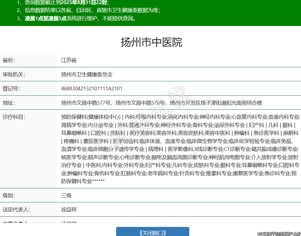 省份:江蘇省審批機(jī)關(guān):揚州市衛(wèi)生健康委員會登記號:46883042132101111A2101地址:揚州市文昌中路577號、揚州市文昌中路578號、揚州市開發(fā)區(qū)揚子津街道陽光南苑綜合樓診療科目:預(yù)防保健科(健康體檢中心) | 內(nèi)科;呼吸內(nèi)科專業(yè);消化內(nèi)科專業(yè);神經(jīng)內(nèi)科專業(yè);心血管內(nèi)科專業(yè);血液內(nèi)科專業(yè);腎病學(xué)專業(yè);內(nèi)分泌專業(yè) | 外科;普通外科專業(yè);神經(jīng)外科專業(yè);骨科專業(yè);泌尿外科專業(yè) | 婦產(chǎn)科 | 兒科 | 眼科 | 耳鼻咽喉科 | 口腔科 | 皮膚科 | 醫(yī)療美容科;美容外科;美容皮膚科;美容中醫(yī)科 | 腫瘤科 | 急診醫(yī)學(xué)科 | 麻醉科 | 疼痛科 | 重癥醫(yī)學(xué)科 | 醫(yī)學(xué)檢驗科;臨床體液、血液專業(yè);臨床微生物學(xué)專業(yè);臨床化學(xué)檢驗專業(yè);臨床免疫、血清學(xué)專業(yè);臨床細(xì)胞分子遺傳學(xué)專業(yè) | 病理科 | 醫(yī)學(xué)影像科;X線診斷專業(yè);CT診斷專業(yè);磁共振成像診斷專業(yè);核醫(yī)學(xué)專業(yè);超聲診斷專業(yè);心電診斷專業(yè);腦電及腦血流圖診斷專業(yè);神經(jīng)肌肉電圖專業(yè);介入放射學(xué)專業(yè);放射治療專業(yè) | 中醫(yī)科;內(nèi)科專業(yè);外科專業(yè);婦產(chǎn)科專業(yè);兒科專業(yè);皮膚科專業(yè);眼科專業(yè);耳鼻咽喉科專業(yè);口腔科專業(yè);腫瘤科專業(yè);骨傷科專業(yè);肛腸科專業(yè);老年病科專業(yè);針灸科專業(yè);推拿科專業(yè);康復(fù)醫(yī)學(xué)專業(yè);急診科專業(yè);預(yù)防保健科專業(yè)******級別:三級法定代表人:徐益祥主要負(fù)責(zé)人:徐益祥執(zhí)業(yè)許可證有效期:2024/11/19 -至- 2036/06/26 -