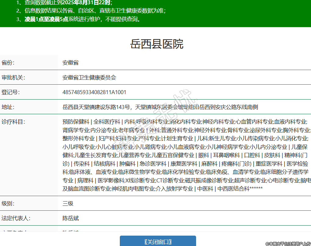 省份:安徽省審批機關(guān):安徽省衛(wèi)生健康委員會登記號:48574859334082811A1001地址:岳西縣天堂鎮(zhèn)建設(shè)東路143號,天堂鎮(zhèn)城東居委會塘坳組沿岳西到安慶公路東線南側(cè)診療科目:預(yù)防保健科 | 全科醫(yī)療科 | 內(nèi)科;呼吸內(nèi)科專業(yè);消化內(nèi)科專業(yè);神經(jīng)內(nèi)科專業(yè);心血管內(nèi)科專業(yè);血液內(nèi)科專業(yè);腎病學(xué)專業(yè);內(nèi)分泌專業(yè);老年病專業(yè) | 外科;普通外科專業(yè);神經(jīng)外科專業(yè);骨科專業(yè);泌尿外科專業(yè);胸外科專業(yè);整形外科專業(yè) | 婦產(chǎn)科;婦科專業(yè);產(chǎn)科專業(yè);計劃生育專業(yè) | 兒科;新生兒專業(yè);小兒傳染病專業(yè);小兒消化專業(yè);小兒呼吸專業(yè);小兒心臟病專業(yè);小兒腎病專業(yè);小兒血液病專業(yè);小兒神經(jīng)病學(xué)專業(yè);小兒內(nèi)分泌專業(yè) | 兒童保健科;兒童生長發(fā)育專業(yè);兒童營養(yǎng)專業(yè);兒童五官保健專業(yè) | 眼科 | 耳鼻咽喉科 | 口腔科 | 皮膚科 | 精神科(門診) | 傳染科 | 結(jié)核病科 | 腫瘤科 | 急診醫(yī)學(xué)科 | 康復(fù)醫(yī)學(xué)科 | 麻醉科 | 疼痛科(門診) | 重癥醫(yī)學(xué)科 | 醫(yī)學(xué)檢驗科;臨床體液、血液專業(yè);臨床微生物學(xué)專業(yè);臨床化學(xué)檢驗專業(yè);臨床免疫、血清學(xué)專業(yè);臨床細胞分子遺傳學(xué)專業(yè) | 病理科 | 醫(yī)學(xué)影像科;X線診斷專業(yè);CT診斷專業(yè);磁共振成像診斷專業(yè);超聲診斷專業(yè);心電診斷專業(yè);腦電及腦血流圖診斷專業(yè);神經(jīng)肌肉電圖專業(yè);介入放射學(xué)專業(yè) | 中醫(yī)科 | 中西醫(yī)結(jié)合科******級別:三級法定代表人:陳岳斌主要負責人:陳岳斌執(zhí)業(yè)許可證有效期:2023/12/25 -至- 2038/12/24 -