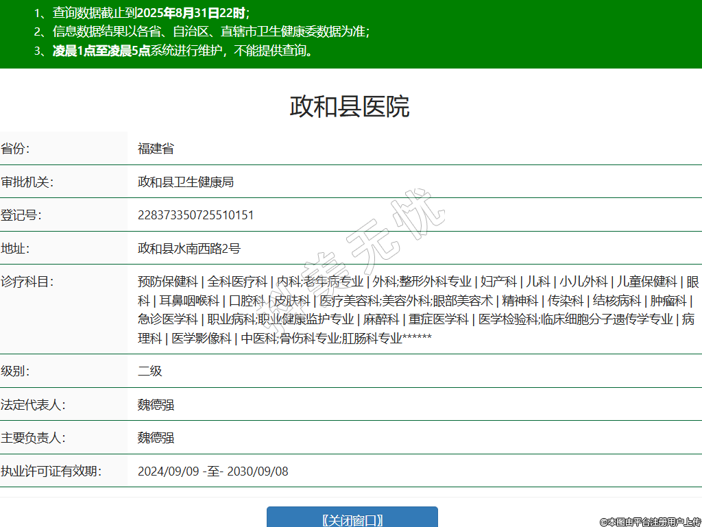 省份:福建省審批機(jī)關(guān):政和縣衛(wèi)生健康局登記號(hào):228373350725510151地址:政和縣水南西路2號(hào)診療科目:預(yù)防保健科 | 全科醫(yī)療科 | 內(nèi)科;老年病專業(yè) | 外科;整形外科專業(yè) | 婦產(chǎn)科 | 兒科 | 小兒外科 | 兒童保健科 | 眼科 | 耳鼻咽喉科 | 口腔科 | 皮膚科 | 醫(yī)療美容科;美容外科;眼部美容術(shù) | 精神科 | 傳染科 | 結(jié)核病科 | 腫瘤科 | 急診醫(yī)學(xué)科 | 職業(yè)病科;職業(yè)健康監(jiān)護(hù)專業(yè) | 麻醉科 | 重癥醫(yī)學(xué)科 | 醫(yī)學(xué)檢驗(yàn)科;臨床細(xì)胞分子遺傳學(xué)專業(yè) | 病理科 | 醫(yī)學(xué)影像科 | 中醫(yī)科;骨傷科專業(yè);肛腸科專業(yè)******級(jí)別:二級(jí)法定代表人:魏德強(qiáng)主要負(fù)責(zé)人:魏德強(qiáng)執(zhí)業(yè)許可證有效期:2024/09/09 -至- 2030/09/08 -