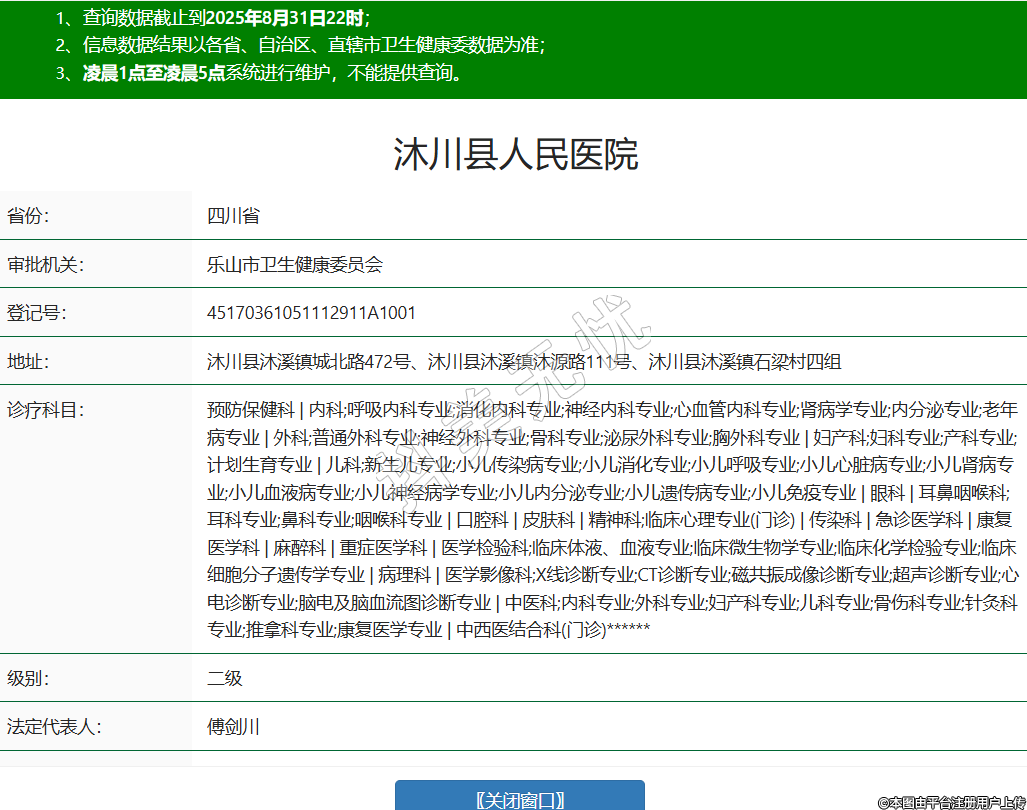 省份:四川省審批機(jī)關(guān):樂山市衛(wèi)生健康委員會(huì)登記號(hào):45170361051112911A1001地址:沐川縣沐溪鎮(zhèn)城北路472號(hào)、沐川縣沐溪鎮(zhèn)沐源路111號(hào)、沐川縣沐溪鎮(zhèn)石梁村四組診療科目:預(yù)防保健科 | 內(nèi)科;呼吸內(nèi)科專業(yè);消化內(nèi)科專業(yè);神經(jīng)內(nèi)科專業(yè);心血管內(nèi)科專業(yè);腎病學(xué)專業(yè);內(nèi)分泌專業(yè);老年病專業(yè) | 外科;普通外科專業(yè);神經(jīng)外科專業(yè);骨科專業(yè);泌尿外科專業(yè);胸外科專業(yè) | 婦產(chǎn)科;婦科專業(yè);產(chǎn)科專業(yè);計(jì)劃生育專業(yè) | 兒科;新生兒專業(yè);小兒傳染病專業(yè);小兒消化專業(yè);小兒呼吸專業(yè);小兒心臟病專業(yè);小兒腎病專業(yè);小兒血液病專業(yè);小兒神經(jīng)病學(xué)專業(yè);小兒內(nèi)分泌專業(yè);小兒遺傳病專業(yè);小兒免疫專業(yè) | 眼科 | 耳鼻咽喉科;耳科專業(yè);鼻科專業(yè);咽喉科專業(yè) | 口腔科 | 皮膚科 | 精神科;臨床心理專業(yè)(門診) | 傳染科 | 急診醫(yī)學(xué)科 | 康復(fù)醫(yī)學(xué)科 | 麻醉科 | 重癥醫(yī)學(xué)科 | 醫(yī)學(xué)檢驗(yàn)科;臨床體液、血液專業(yè);臨床微生物學(xué)專業(yè);臨床化學(xué)檢驗(yàn)專業(yè);臨床細(xì)胞分子遺傳學(xué)專業(yè) | 病理科 | 醫(yī)學(xué)影像科;X線診斷專業(yè);CT診斷專業(yè);磁共振成像診斷專業(yè);超聲診斷專業(yè);心電診斷專業(yè);腦電及腦血流圖診斷專業(yè) | 中醫(yī)科;內(nèi)科專業(yè);外科專業(yè);婦產(chǎn)科專業(yè);兒科專業(yè);骨傷科專業(yè);針灸科專業(yè);推拿科專業(yè);康復(fù)醫(yī)學(xué)專業(yè) | 中西醫(yī)結(jié)合科(門診)******級(jí)別:二級(jí)法定代表人:傅劍川主要負(fù)責(zé)人:傅劍川執(zhí)業(yè)許可證有效期:2023/08/10 -至- 2026/12/19 -