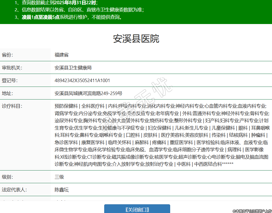 省份:福建省審批機(jī)關(guān):安溪縣衛(wèi)生健康局登記號(hào):48942342X35052411A1001地址:安溪縣鳳城鎮(zhèn)河濱南路249-259號(hào)診療科目:預(yù)防保健科 | 全科醫(yī)療科 | 內(nèi)科;呼吸內(nèi)科專業(yè);消化內(nèi)科專業(yè);神經(jīng)內(nèi)科專業(yè);心血管內(nèi)科專業(yè);血液內(nèi)科專業(yè);腎病學(xué)專業(yè);內(nèi)分泌專業(yè);免疫學(xué)專業(yè);變態(tài)反應(yīng)專業(yè);老年病專業(yè) | 外科;普通外科專業(yè);神經(jīng)外科專業(yè);骨科專業(yè);泌尿外科專業(yè);胸外科專業(yè);心臟大血管外科專業(yè);燒傷科專業(yè);整形外科專業(yè) | 婦產(chǎn)科;婦科專業(yè);產(chǎn)科專業(yè);計(jì)劃生育專業(yè);優(yōu)生學(xué)專業(yè);生殖健康與不孕癥專業(yè) | 婦女保健科 | 兒科;新生兒專業(yè) | 兒童保健科 | 眼科 | 耳鼻咽喉科;耳科專業(yè);鼻科專業(yè);咽喉科專業(yè) | 口腔科 | 皮膚科 | 醫(yī)療美容科;美容皮膚科 | 傳染科 | 結(jié)核病科 | 腫瘤科 | 急診醫(yī)學(xué)科 | 康復(fù)醫(yī)學(xué)科 | 臨終關(guān)懷科 | 麻醉科 | 疼痛科 | 重癥醫(yī)學(xué)科 | 醫(yī)學(xué)檢驗(yàn)科;臨床體液、血液專業(yè);臨床微生物學(xué)專業(yè);臨床化學(xué)檢驗(yàn)專業(yè);臨床免疫、血清學(xué)專業(yè);臨床細(xì)胞分子遺傳學(xué)專業(yè) | 病理科 | 醫(yī)學(xué)影像科;X線診斷專業(yè);CT診斷專業(yè);磁共振成像診斷專業(yè);核醫(yī)學(xué)專業(yè);超聲診斷專業(yè);心電診斷專業(yè);腦電及腦血流圖診斷專業(yè);神經(jīng)肌肉電圖專業(yè);介入放射學(xué)專業(yè);放射治療專業(yè) | 中醫(yī)科 | 中西醫(yī)結(jié)合科******級(jí)別:三級(jí)法定代表人:陳鑫壇主要負(fù)責(zé)人:陳鑫壇執(zhí)業(yè)許可證有效期:2022/10/01 -至- 2028/09/30 -