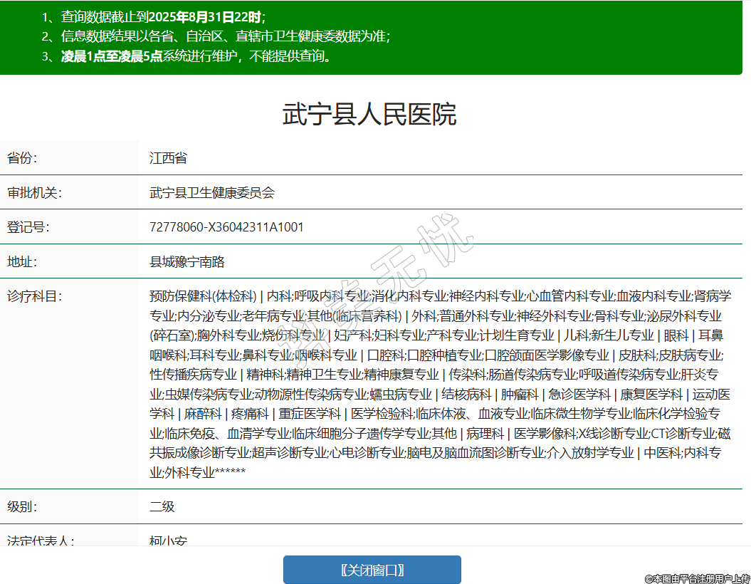 省份:江西省審批機關:武寧縣衛(wèi)生健康委員會登記號:72778060-X36042311A1001地址:縣城豫寧南路診療科目:預防保健科(體檢科) | 內科;呼吸內科專業(yè);消化內科專業(yè);神經內科專業(yè);心血管內科專業(yè);血液內科專業(yè);腎病學專業(yè);內分泌專業(yè);老年病專業(yè);其他(臨床營養(yǎng)科) | 外科;普通外科專業(yè);神經外科專業(yè);骨科專業(yè);泌尿外科專業(yè)(碎石室);胸外科專業(yè);燒傷科專業(yè) | 婦產科;婦科專業(yè);產科專業(yè);計劃生育專業(yè) | 兒科;新生兒專業(yè) | 眼科 | 耳鼻咽喉科;耳科專業(yè);鼻科專業(yè);咽喉科專業(yè) | 口腔科;口腔種植專業(yè);口腔頜面醫(yī)學影像專業(yè) | 皮膚科;皮膚病專業(yè);性傳播疾病專業(yè) | 精神科;精神衛(wèi)生專業(yè);精神康復專業(yè) | 傳染科;腸道傳染病專業(yè);呼吸道傳染病專業(yè);肝炎專業(yè);蟲媒傳染病專業(yè);動物源性傳染病專業(yè);蠕蟲病專業(yè) | 結核病科 | 腫瘤科 | 急診醫(yī)學科 | 康復醫(yī)學科 | 運動醫(yī)學科 | 麻醉科 | 疼痛科 | 重癥醫(yī)學科 | 醫(yī)學檢驗科;臨床體液、血液專業(yè);臨床微生物學專業(yè);臨床化學檢驗專業(yè);臨床免疫、血清學專業(yè);臨床細胞分子遺傳學專業(yè);其他 | 病理科 | 醫(yī)學影像科;X線診斷專業(yè);CT診斷專業(yè);磁共振成像診斷專業(yè);超聲診斷專業(yè);心電診斷專業(yè);腦電及腦血流圖診斷專業(yè);介入放射學專業(yè) | 中醫(yī)科;內科專業(yè);外科專業(yè)******級別:二級法定代表人:柯小安主要負責人:柯小安執(zhí)業(yè)許可證有效期:2025/06/06 -至- 2030/06/06 -