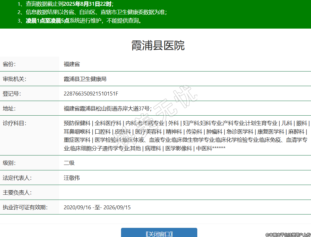 省份:福建省審批機關:霞浦縣衛(wèi)生健康局登記號:228766350921510151F地址:福建省霞浦縣松山街道赤岸大道37號;診療科目:預防保健科 | 全科醫(yī)療科 | 內(nèi)科;老年病專業(yè) | 外科 | 婦產(chǎn)科;婦科專業(yè);產(chǎn)科專業(yè);計劃生育專業(yè) | 兒科 | 眼科 | 耳鼻咽喉科 | 口腔科 | 皮膚科 | 醫(yī)療美容科 | 精神科 | 傳染科 | 腫瘤科 | 急診醫(yī)學科 | 康復醫(yī)學科 | 麻醉科 | 重癥醫(yī)學科 | 醫(yī)學檢驗科;臨床體液、血液專業(yè);臨床微生物學專業(yè);臨床化學檢驗專業(yè);臨床免疫、血清學專業(yè);臨床細胞分子遺傳學專業(yè);其他 | 病理科 | 醫(yī)學影像科 | 中醫(yī)科******級別:二級法定代表人:汪敬偉主要負責人:執(zhí)業(yè)許可證有效期:2020/09/16 -至- 2026/09/15 -