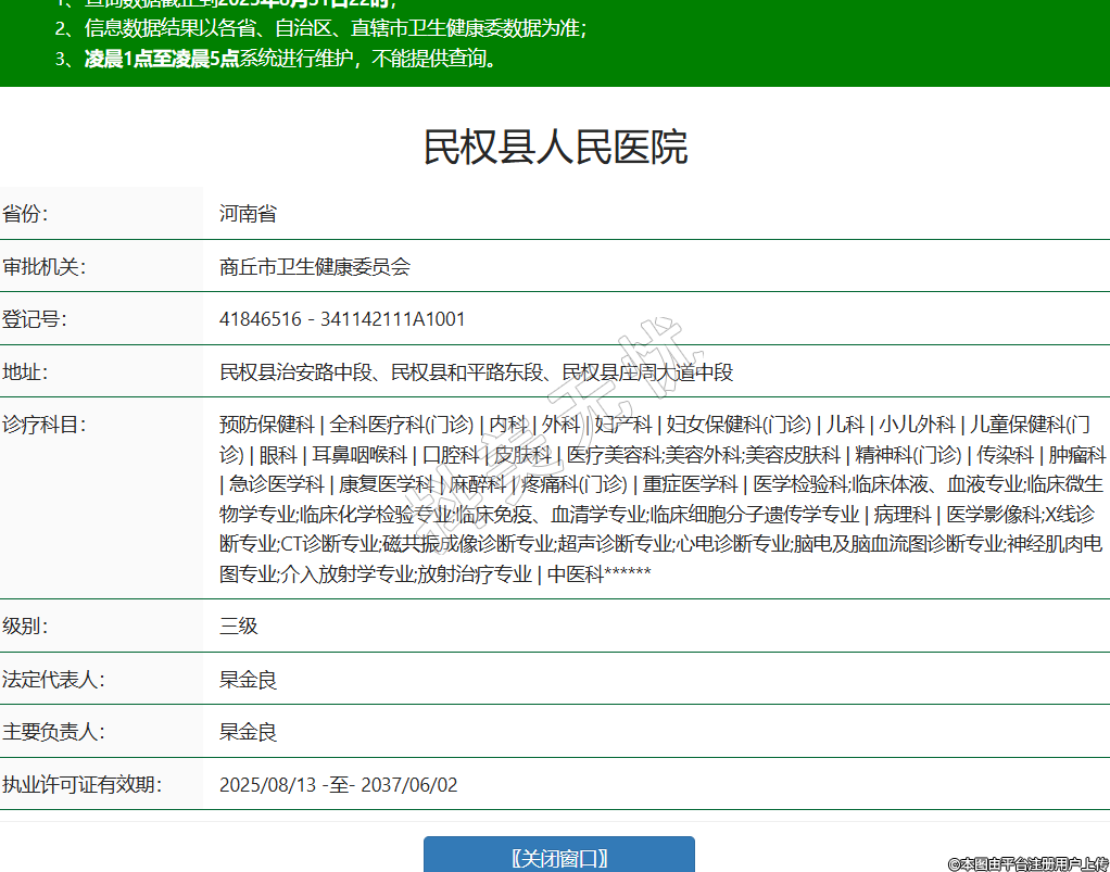 省份:河南省審批機(jī)關(guān):商丘市衛(wèi)生健康委員會(huì)登記號(hào):41846516-341142111A1001地址:民權(quán)縣治安路中段、民權(quán)縣和平路東段、民權(quán)縣莊周大道中段診療科目:預(yù)防保健科 | 全科醫(yī)療科(門(mén)診) | 內(nèi)科 | 外科 | 婦產(chǎn)科 | 婦女保健科(門(mén)診) | 兒科 | 小兒外科 | 兒童保健科(門(mén)診) | 眼科 | 耳鼻咽喉科 | 口腔科 | 皮膚科 | 醫(yī)療美容科;美容外科;美容皮膚科 | 精神科(門(mén)診) | 傳染科 | 腫瘤科 | 急診醫(yī)學(xué)科 | 康復(fù)醫(yī)學(xué)科 | 麻醉科 | 疼痛科(門(mén)診) | 重癥醫(yī)學(xué)科 | 醫(yī)學(xué)檢驗(yàn)科;臨床體液、血液專(zhuān)業(yè);臨床微生物學(xué)專(zhuān)業(yè);臨床化學(xué)檢驗(yàn)專(zhuān)業(yè);臨床免疫、血清學(xué)專(zhuān)業(yè);臨床細(xì)胞分子遺傳學(xué)專(zhuān)業(yè) | 病理科 | 醫(yī)學(xué)影像科;X線診斷專(zhuān)業(yè);CT診斷專(zhuān)業(yè);磁共振成像診斷專(zhuān)業(yè);超聲診斷專(zhuān)業(yè);心電診斷專(zhuān)業(yè);腦電及腦血流圖診斷專(zhuān)業(yè);神經(jīng)肌肉電圖專(zhuān)業(yè);介入放射學(xué)專(zhuān)業(yè);放射治療專(zhuān)業(yè) | 中醫(yī)科******級(jí)別:三級(jí)法定代表人:杲金良主要負(fù)責(zé)人:杲金良執(zhí)業(yè)許可證有效期:2025/08/13 -至- 2037/06/02 -