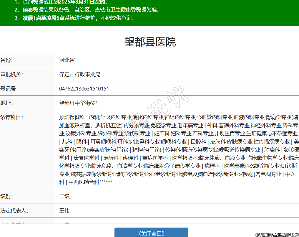 省份:河北省審批機關:保定市行政審批局登記號:047622130631510151地址:望都縣中華街62號診療科目:預防保健科 | 內科;呼吸內科專業(yè);消化內科專業(yè);神經內科專業(yè);心血管內科專業(yè);血液內科專業(yè);腎病學專業(yè)(增加血液透析室,透析機五臺);內分泌專業(yè);免疫學專業(yè);老年病專業(yè) | 外科;普通外科專業(yè);神經外科專業(yè);骨科專業(yè);泌尿外科專業(yè);胸外科專業(yè);燒傷科專業(yè) | 婦產科;婦科專業(yè);產科專業(yè);計劃生育專業(yè);生殖健康與不孕癥專業(yè) | 兒科 | 眼科 | 耳鼻咽喉科;耳科專業(yè);鼻科專業(yè);咽喉科專業(yè) | 口腔科 | 皮膚科;皮膚病專業(yè);性傳播疾病專業(yè) | 美容牙科(門診);美容皮膚科(門診) | 精神科(門診) | 傳染科;腸道傳染病專業(yè);呼吸道傳染病專業(yè) | 腫瘤科 | 急診醫(yī)學科 | 康復醫(yī)學科 | 麻醉科 | 疼痛科 | 重癥醫(yī)學科 | 醫(yī)學檢驗科;臨床體液、血液專業(yè);臨床微生物學專業(yè);臨床化學檢驗專業(yè);臨床免疫、血清學專業(yè);臨床細胞分子遺傳學專業(yè) | 病理科 | 醫(yī)學影像科;X線診斷專業(yè);CT診斷專業(yè);磁共振成像診斷專業(yè);超聲診斷專業(yè);心電診斷專業(yè);腦電及腦血流圖診斷專業(yè);神經肌肉電圖專業(yè) | 中醫(yī)科 | 中西醫(yī)結合科******級別:二級法定代表人:王偉主要負責人:王偉執(zhí)業(yè)許可證有效期:2023/07/01 -至- 2038/06/30 -