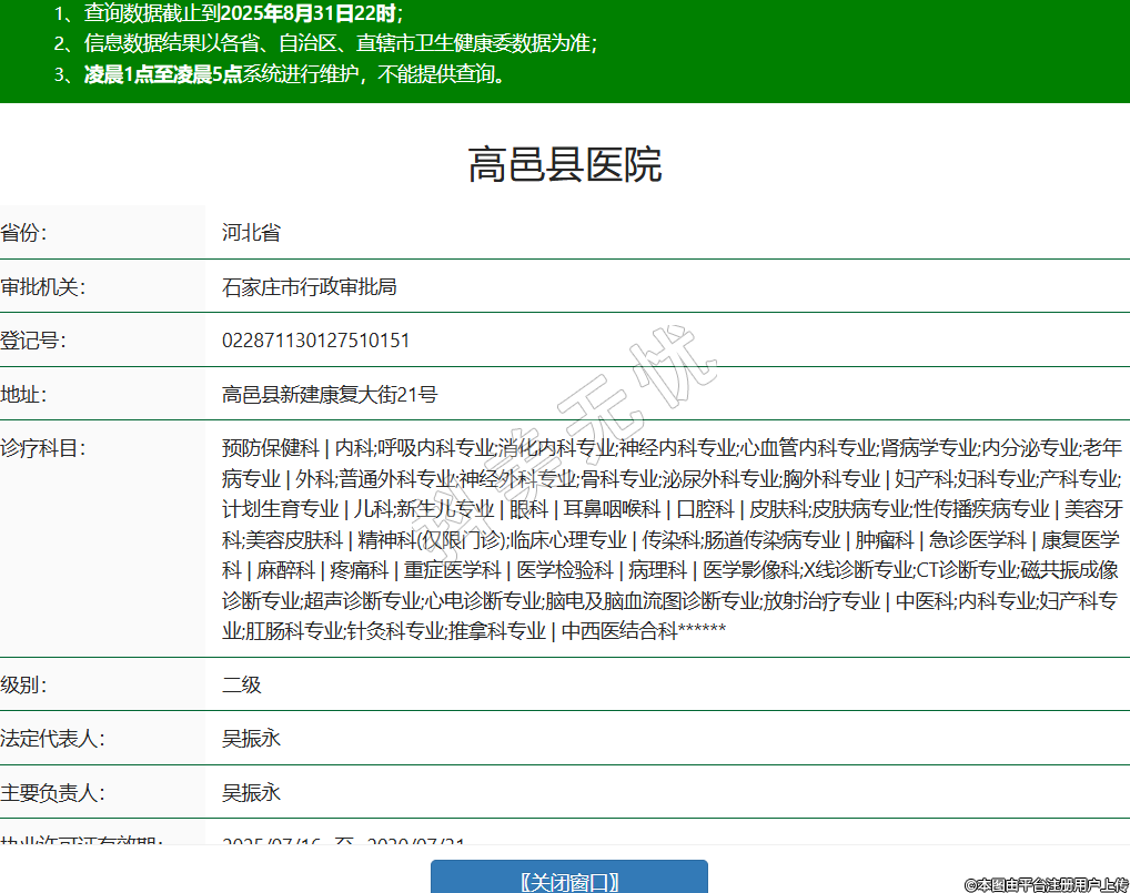 省份:河北省審批機(jī)關(guān):石家莊市行政審批局登記號(hào):022871130127510151地址:高邑縣新建康復(fù)大街21號(hào)診療科目:預(yù)防保健科 | 內(nèi)科;呼吸內(nèi)科專業(yè);消化內(nèi)科專業(yè);神經(jīng)內(nèi)科專業(yè);心血管內(nèi)科專業(yè);腎病學(xué)專業(yè);內(nèi)分泌專業(yè);老年病專業(yè) | 外科;普通外科專業(yè);神經(jīng)外科專業(yè);骨科專業(yè);泌尿外科專業(yè);胸外科專業(yè) | 婦產(chǎn)科;婦科專業(yè);產(chǎn)科專業(yè);計(jì)劃生育專業(yè) | 兒科;新生兒專業(yè) | 眼科 | 耳鼻咽喉科 | 口腔科 | 皮膚科;皮膚病專業(yè);性傳播疾病專業(yè) | 美容牙科;美容皮膚科 | 精神科(僅限門診);臨床心理專業(yè) | 傳染科;腸道傳染病專業(yè) | 腫瘤科 | 急診醫(yī)學(xué)科 | 康復(fù)醫(yī)學(xué)科 | 麻醉科 | 疼痛科 | 重癥醫(yī)學(xué)科 | 醫(yī)學(xué)檢驗(yàn)科 | 病理科 | 醫(yī)學(xué)影像科;X線診斷專業(yè);CT診斷專業(yè);磁共振成像診斷專業(yè);超聲診斷專業(yè);心電診斷專業(yè);腦電及腦血流圖診斷專業(yè);放射治療專業(yè) | 中醫(yī)科;內(nèi)科專業(yè);婦產(chǎn)科專業(yè);肛腸科專業(yè);針灸科專業(yè);推拿科專業(yè) | 中西醫(yī)結(jié)合科******級(jí)別:二級(jí)法定代表人:吳振永主要負(fù)責(zé)人:吳振永執(zhí)業(yè)許可證有效期:2025/07/16 -至- 2030/07/31 -