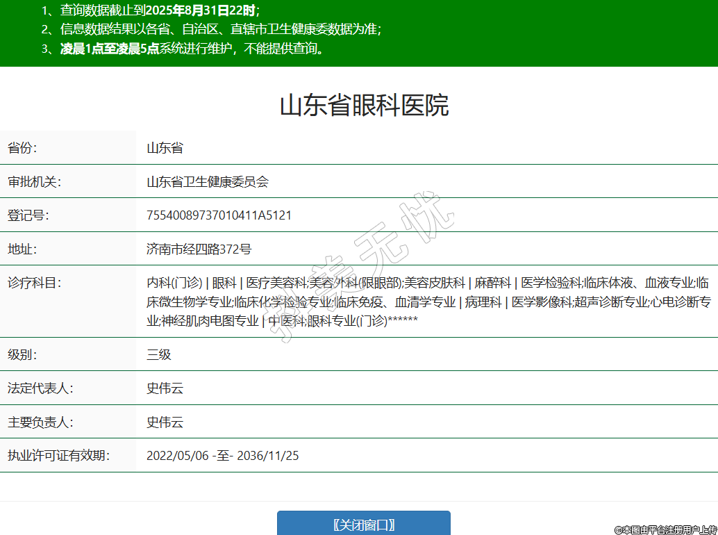 省份:山東省審批機關(guān):山東省衛(wèi)生健康委員會登記號:75540089737010411A5121地址:濟南市經(jīng)四路372號診療科目:內(nèi)科(門診) | 眼科 | 醫(yī)療美容科;美容外科(限眼部);美容皮膚科 | 麻醉科 | 醫(yī)學(xué)檢驗科;臨床體液、血液專業(yè);臨床微生物學(xué)專業(yè);臨床化學(xué)檢驗專業(yè);臨床免疫、血清學(xué)專業(yè) | 病理科 | 醫(yī)學(xué)影像科;超聲診斷專業(yè);心電診斷專業(yè);神經(jīng)肌肉電圖專業(yè) | 中醫(yī)科;眼科專業(yè)(門診)******級別:三級法定代表人:史偉云主要負(fù)責(zé)人:史偉云執(zhí)業(yè)許可證有效期:2022/05/06 -至- 2036/11/25 -
