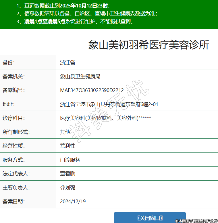 省份:浙江省備案機關:象山縣衛(wèi)生健康局備案編號:MAE347Q3633022590D2212地址:浙江省寧波市象山縣丹東街道東望府6幢2-01診療科目:醫(yī)療美容科(美容皮膚科、美容外科)******所有制形式:其他經(jīng)營性質(zhì):營利性服務方式:門診服務法定代表人:章君鵬主要負責人:龔劃強備案日期:2024/12/19 -