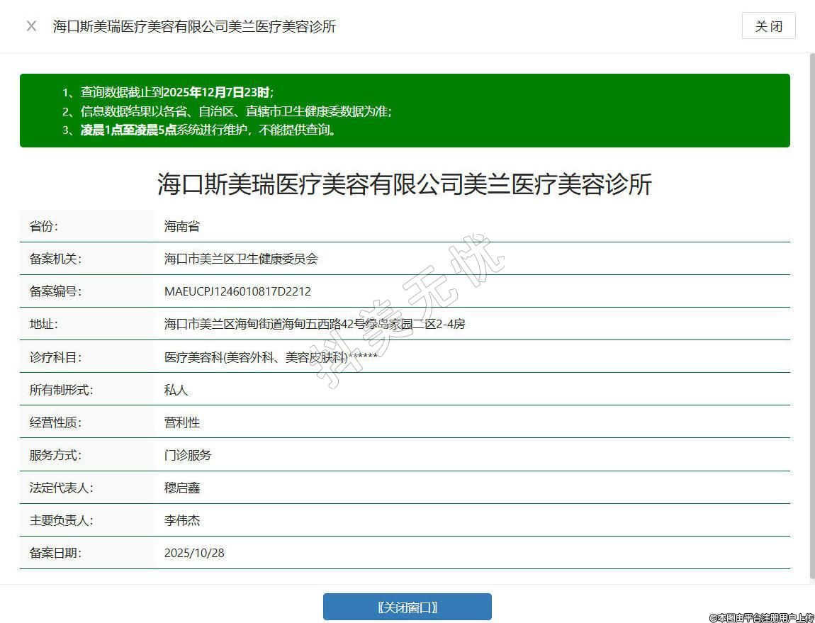 海口斯美瑞醫(yī)療美容診所成立于2025年,位于海南省海口市美蘭區(qū)海甸街道海甸五西路42號綠島家園二區(qū)2-4房,是經(jīng)當(dāng)?shù)匦l(wèi)生主管部門批準(zhǔn)設(shè)立的正規(guī)醫(yī)療美容機構(gòu),提供合規(guī)、專業(yè)的醫(yī)療美容服務(wù),配備標(biāo)準(zhǔn)化診療空間與專業(yè)醫(yī)療設(shè)備,可開展眼部塑形、鼻部整形、皮膚養(yǎng)護、微創(chuàng)抗衰等合規(guī)醫(yī)療美容項目,堅持 “安全為先、個性化定制” 的服務(wù)理念,以嚴(yán)謹?shù)尼t(yī)療態(tài)度、貼心的診療服務(wù),為不同需求的求美者提供安心的變美體驗。