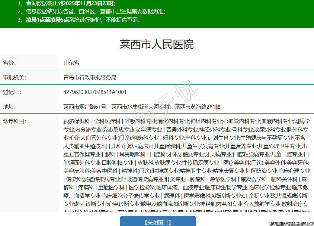 省份:山東省審批機關(guān):青島市行政審批服務(wù)局登記號:42796203037028511A1001地址:萊西市煙臺路67號、萊西市水集街道崗河頭村、萊西市黃海路2#1幢診療科目:預(yù)防保健科 | 全科醫(yī)療科 | 呼吸內(nèi)科專業(yè);消化內(nèi)科專業(yè);神經(jīng)內(nèi)科專業(yè);心血管內(nèi)科專業(yè);血液內(nèi)科專業(yè);腎病學專業(yè);內(nèi)分泌專業(yè);變態(tài)反應(yīng)專業(yè);老年病專業(yè) | 普通外科專業(yè);神經(jīng)外科專業(yè);骨科專業(yè);泌尿外科專業(yè);胸外科專業(yè);心臟大血管外科專業(yè)(門診);燒傷科專業(yè) | 婦科專業(yè);產(chǎn)科專業(yè);計劃生育專業(yè);生殖健康與不孕癥專業(yè)(不含人類輔助生殖技術(shù)) | 兒科(門診+病房) | 兒童保健科;兒童生長發(fā)育專業(yè);兒童營養(yǎng)專業(yè);兒童心理衛(wèi)生專業(yè);兒童五官保健專業(yè) | 眼科 | 耳鼻咽喉科 | 口腔科;牙體牙髓病專業(yè);牙周病專業(yè);口腔粘膜病專業(yè);兒童口腔專業(yè);口腔頜面外科專業(yè);口腔種植專業(yè) | 皮膚科;皮膚病專業(yè);性傳播疾病專業(yè) | 醫(yī)療美容科(門診);美容外科;美容牙科;美容皮膚科;美容中醫(yī)科 | 精神科(門診);精神病專業(yè);精神衛(wèi)生專業(yè);精神康復專業(yè);社區(qū)防治專業(yè);臨床心理專業(yè) | 傳染科;腸道傳染病專業(yè);呼吸道傳染病專業(yè);肝炎專業(yè) | 腫瘤科 | 急診醫(yī)學科 | 康復醫(yī)學科 | 臨終關(guān)懷科 | 麻醉科 | 疼痛科 | 重癥醫(yī)學科 | 醫(yī)學檢驗科;臨床體液、血液專業(yè);臨床微生物學專業(yè);臨床化學檢驗專業(yè);臨床免疫、血清學專業(yè);臨床細胞分子遺傳學專業(yè) | 病理科 | 醫(yī)學影像科;X線診斷專業(yè);CT診斷專業(yè);磁共振成像診斷專業(yè);超聲診斷專業(yè);心電診斷專業(yè);腦電及腦血流圖診斷專業(yè);神經(jīng)肌肉電圖專業(yè);介入放射學專業(yè);放射治療專業(yè) | 中醫(yī)科;內(nèi)科專業(yè);婦產(chǎn)科專業(yè);兒科專業(yè);皮膚科專業(yè);腫瘤科專業(yè);骨傷科專業(yè);肛腸科專業(yè);老年病科專業(yè);針灸科專業(yè);推拿科專業(yè);康復醫(yī)學專業(yè);預(yù)防保健科專業(yè) | 中西醫(yī)結(jié)合科******級別:二級法定代表人:閆泰山主要負責人:閆泰山執(zhí)業(yè)許可證有效期:2017/09/17 -至- 2032/09/16 -