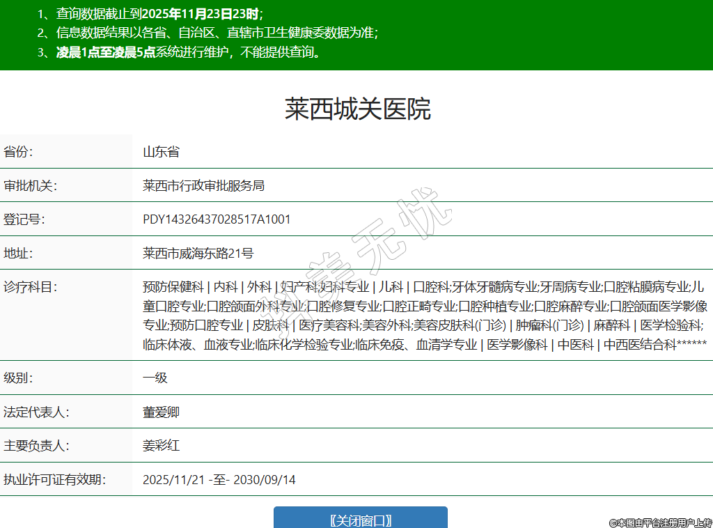 省份:山東省審批機(jī)關(guān):萊西市行政審批服務(wù)局登記號:PDY14326437028517A1001地址:萊西市威海東路21號診療科目:預(yù)防保健科 | 內(nèi)科 | 外科 | 婦產(chǎn)科;婦科專業(yè) | 兒科 | 口腔科;牙體牙髓病專業(yè);牙周病專業(yè);口腔粘膜病專業(yè);兒童口腔專業(yè);口腔頜面外科專業(yè);口腔修復(fù)專業(yè);口腔正畸專業(yè);口腔種植專業(yè);口腔麻醉專業(yè);口腔頜面醫(yī)學(xué)影像專業(yè);預(yù)防口腔專業(yè) | 皮膚科 | 醫(yī)療美容科;美容外科;美容皮膚科(門診) | 腫瘤科(門診) | 麻醉科 | 醫(yī)學(xué)檢驗(yàn)科;臨床體液、血液專業(yè);臨床化學(xué)檢驗(yàn)專業(yè);臨床免疫、血清學(xué)專業(yè) | 醫(yī)學(xué)影像科 | 中醫(yī)科 | 中西醫(yī)結(jié)合科******級別:一級法定代表人:董愛卿主要負(fù)責(zé)人:姜彩紅執(zhí)業(yè)許可證有效期:2025/11/21 -至- 2030/09/14 -