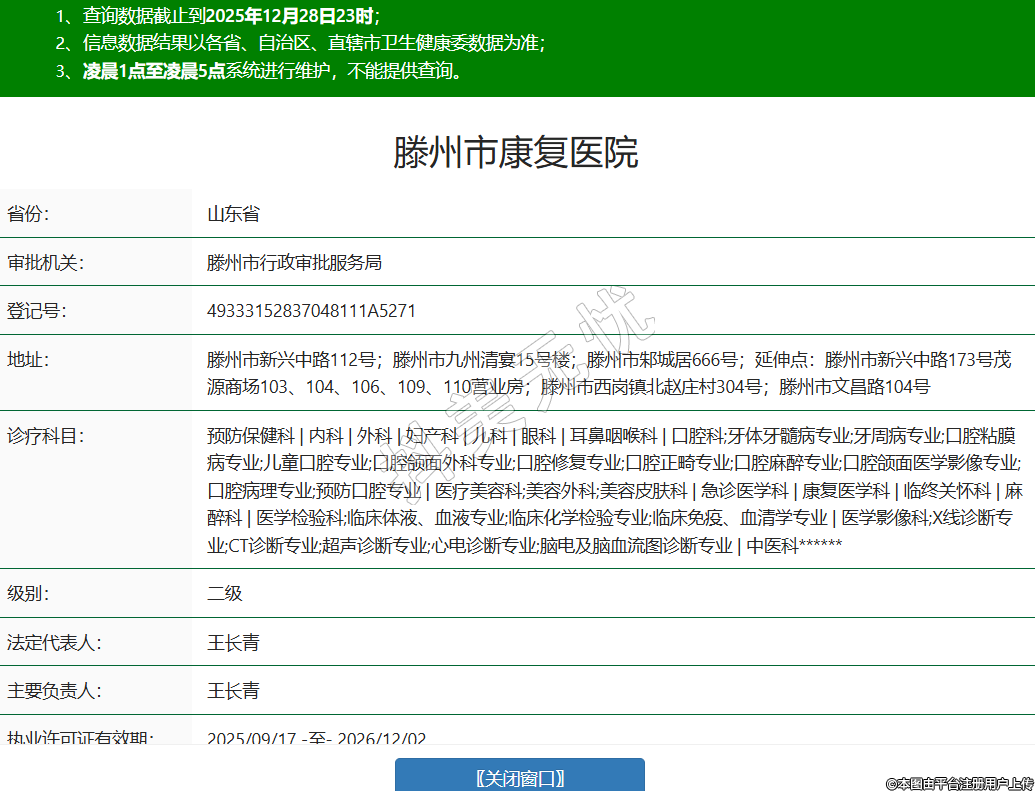 省份:山東省審批機關:滕州市行政審批服務局登記號:49333152837048111A5271地址:滕州市新興中路112號;滕州市九州清宴15號樓;滕州市邾城居666號;延伸點:滕州市新興中路173號茂源商場103、104、106、109、110營業(yè)房;滕州市西崗鎮(zhèn)北趙莊村304號;滕州市文昌路104號診療科目:預防保健科 | 內科 | 外科 | 婦產科 | 兒科 | 眼科 | 耳鼻咽喉科 | 口腔科;牙體牙髓病專業(yè);牙周病專業(yè);口腔粘膜病專業(yè);兒童口腔專業(yè);口腔頜面外科專業(yè);口腔修復專業(yè);口腔正畸專業(yè);口腔麻醉專業(yè);口腔頜面醫(yī)學影像專業(yè);口腔病理專業(yè);預防口腔專業(yè) | 醫(yī)療美容科;美容外科;美容皮膚科 | 急診醫(yī)學科 | 康復醫(yī)學科 | 臨終關懷科 | 麻醉科 | 醫(yī)學檢驗科;臨床體液、血液專業(yè);臨床化學檢驗專業(yè);臨床免疫、血清學專業(yè) | 醫(yī)學影像科;X線診斷專業(yè);CT診斷專業(yè);超聲診斷專業(yè);心電診斷專業(yè);腦電及腦血流圖診斷專業(yè) | 中醫(yī)科******級別:二級法定代表人:王長青主要負責人:王長青執(zhí)業(yè)許可證有效期:2025/09/17 -至- 2026/12/02 -