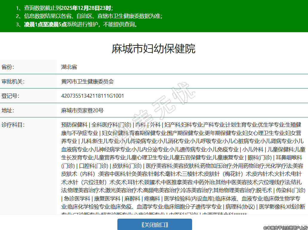 省份:湖北省審批機(jī)關(guān):黃岡市衛(wèi)生健康委員會(huì)登記號(hào):42073551342118111G1001地址:麻城市貢家巷20號(hào)診療科目:預(yù)防保健科 | 全科醫(yī)療科(門診) | 內(nèi)科 | 外科 | 婦產(chǎn)科;婦科專業(yè);產(chǎn)科專業(yè);計(jì)劃生育專業(yè);優(yōu)生學(xué)專業(yè);生殖健康與不孕癥專業(yè) | 婦女保健科;青春期保健專業(yè);圍產(chǎn)期保健專業(yè);更年期保健專業(yè);婦女心理衛(wèi)生專業(yè);婦女營(yíng)養(yǎng)專業(yè) | 兒科;新生兒專業(yè);小兒傳染病專業(yè);小兒消化專業(yè);小兒呼吸專業(yè);小兒心臟病專業(yè);小兒腎病專業(yè);小兒血液病專業(yè);小兒神經(jīng)病學(xué)專業(yè);小兒內(nèi)分泌專業(yè);小兒遺傳病專業(yè);小兒免疫專業(yè) | 小兒外科 | 兒童保健科;兒童生長(zhǎng)發(fā)育專業(yè);兒童營(yíng)養(yǎng)專業(yè);兒童心理衛(wèi)生專業(yè);兒童五官保健專業(yè);兒童康復(fù)專業(yè) | 眼科(門診) | 耳鼻咽喉科(門診) | 口腔科(門診) | 皮膚科(門診) | 醫(yī)療美容科;美容皮膚科;藥物加壓治療;外用藥物治療;光化學(xué)療法;美容皮膚術(shù)(內(nèi)科);美容中醫(yī)科;針灸美容;針刺術(shù);毫針術(shù);三棱針術(shù);皮膚針(梅花針)術(shù);皮內(nèi)針術(shù);火針術(shù);電針術(shù);水針(穴位注射)術(shù);炙術(shù);耳針術(shù);拔罐術(shù);中醫(yī)推拿美容;中藥外治;其他中醫(yī)美容技術(shù);穴位埋線療法;結(jié)扎法;物理美容治療術(shù);激光美容治療術(shù);高頻電美容治療;冷凍美容治療;其他物理美容治療;脫毛術(shù) | 傳染科(門診) | 急診醫(yī)學(xué)科 | 康復(fù)醫(yī)學(xué)科 | 麻醉科 | 疼痛科 | 醫(yī)學(xué)檢驗(yàn)科(內(nèi)設(shè)血庫(kù));臨床體液、血液專業(yè);臨床微生物學(xué)專業(yè);臨床化學(xué)檢驗(yàn)專業(yè);臨床免疫、血清學(xué)專業(yè);臨床細(xì)胞分子遺傳學(xué)專業(yè) | 病理科(協(xié)議) | 醫(yī)學(xué)影像科;X線診斷專業(yè);CT診斷專業(yè);超聲診斷專業(yè);心電診斷專業(yè) | 中醫(yī)科(門診) | 中西醫(yī)結(jié)合科******級(jí)別:三級(jí)法定代表人:李靜主要負(fù)責(zé)人:李靜執(zhí)業(yè)許可證有效期:2025/12/12 -至- 2037/11/02 -