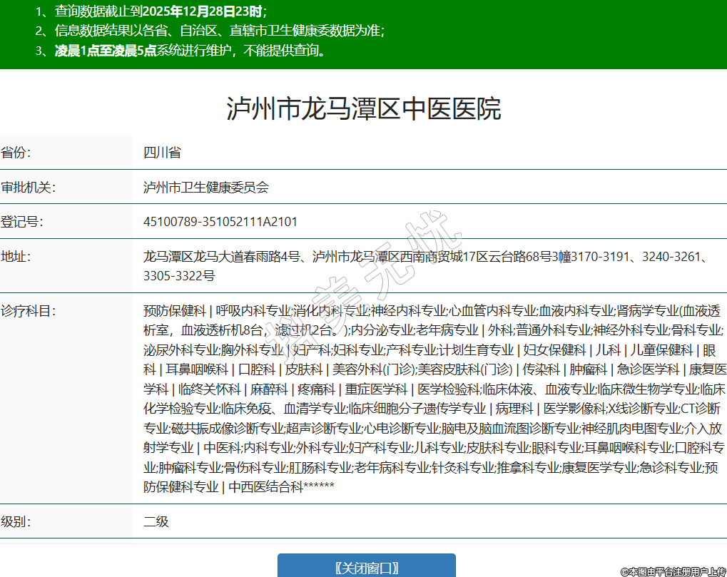 省份:四川省審批機(jī)關(guān):瀘州市衛(wèi)生健康委員會(huì)登記號(hào):45100789-351052111A2101地址:龍馬潭區(qū)龍馬大道春雨路4號(hào)、瀘州市龍馬潭區(qū)西南商貿(mào)城17區(qū)云臺(tái)路68號(hào)3幢3170-3191、3240-3261、3305-3322號(hào)診療科目:預(yù)防保健科 | 呼吸內(nèi)科專(zhuān)業(yè);消化內(nèi)科專(zhuān)業(yè);神經(jīng)內(nèi)科專(zhuān)業(yè);心血管內(nèi)科專(zhuān)業(yè);血液內(nèi)科專(zhuān)業(yè);腎病學(xué)專(zhuān)業(yè)(血液透析室,血液透析機(jī)8臺(tái),濾過(guò)機(jī)2臺(tái)。);內(nèi)分泌專(zhuān)業(yè);老年病專(zhuān)業(yè) | 外科;普通外科專(zhuān)業(yè);神經(jīng)外科專(zhuān)業(yè);骨科專(zhuān)業(yè);泌尿外科專(zhuān)業(yè);胸外科專(zhuān)業(yè) | 婦產(chǎn)科;婦科專(zhuān)業(yè);產(chǎn)科專(zhuān)業(yè);計(jì)劃生育專(zhuān)業(yè) | 婦女保健科 | 兒科 | 兒童保健科 | 眼科 | 耳鼻咽喉科 | 口腔科 | 皮膚科 | 美容外科(門(mén)診);美容皮膚科(門(mén)診) | 傳染科 | 腫瘤科 | 急診醫(yī)學(xué)科 | 康復(fù)醫(yī)學(xué)科 | 臨終關(guān)懷科 | 麻醉科 | 疼痛科 | 重癥醫(yī)學(xué)科 | 醫(yī)學(xué)檢驗(yàn)科;臨床體液、血液專(zhuān)業(yè);臨床微生物學(xué)專(zhuān)業(yè);臨床化學(xué)檢驗(yàn)專(zhuān)業(yè);臨床免疫、血清學(xué)專(zhuān)業(yè);臨床細(xì)胞分子遺傳學(xué)專(zhuān)業(yè) | 病理科 | 醫(yī)學(xué)影像科;X線診斷專(zhuān)業(yè);CT診斷專(zhuān)業(yè);磁共振成像診斷專(zhuān)業(yè);超聲診斷專(zhuān)業(yè);心電診斷專(zhuān)業(yè);腦電及腦血流圖診斷專(zhuān)業(yè);神經(jīng)肌肉電圖專(zhuān)業(yè);介入放射學(xué)專(zhuān)業(yè) | 中醫(yī)科;內(nèi)科專(zhuān)業(yè);外科專(zhuān)業(yè);婦產(chǎn)科專(zhuān)業(yè);兒科專(zhuān)業(yè);皮膚科專(zhuān)業(yè);眼科專(zhuān)業(yè);耳鼻咽喉科專(zhuān)業(yè);口腔科專(zhuān)業(yè);腫瘤科專(zhuān)業(yè);骨傷科專(zhuān)業(yè);肛腸科專(zhuān)業(yè);老年病科專(zhuān)業(yè);針灸科專(zhuān)業(yè);推拿科專(zhuān)業(yè);康復(fù)醫(yī)學(xué)專(zhuān)業(yè);急診科專(zhuān)業(yè);預(yù)防保健科專(zhuān)業(yè) | 中西醫(yī)結(jié)合科******級(jí)別:二級(jí)法定代表人:劉昌勇主要負(fù)責(zé)人:劉昌勇執(zhí)業(yè)許可證有效期:2021/12/31 -至- 2030/12/31 -
