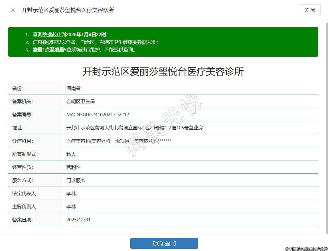 開封愛麗莎璽悅臺醫(yī)療美容診所成立于2023年,位于河南省開封市示范區(qū)黃河大街北段鼎立國際C區(qū)29號樓1-2層106號營業(yè)房,是經(jīng)衛(wèi)生部門審核批準、持有《醫(yī)療機構(gòu)執(zhí)業(yè)許可證》的正規(guī)醫(yī)療美容機構(gòu),業(yè)務范圍涵蓋醫(yī)療美容服務、生活美容服務等許可項目,提供眼部整形、鼻部整形、面部抗衰、皮膚護理等多樣化診療服務,全程落實術前知情告知與術后跟蹤護理制度水滴信用。