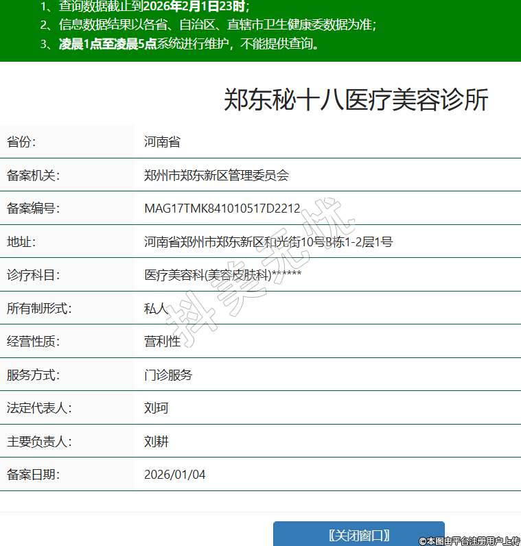 省份:河南省備案機(jī)關(guān):鄭州市鄭東新區(qū)管理委員會(huì)備案編號(hào):MAG17TMK841010517D2212地址:河南省鄭州市鄭東新區(qū)和光街10號(hào)B棟1-2層1號(hào)診療科目:醫(yī)療美容科(美容皮膚科)******所有制形式:私人經(jīng)營(yíng)性質(zhì):營(yíng)利性服務(wù)方式:門診服務(wù)法定代表人:劉珂主要負(fù)責(zé)人:劉耕備案日期:2026/01/04 -