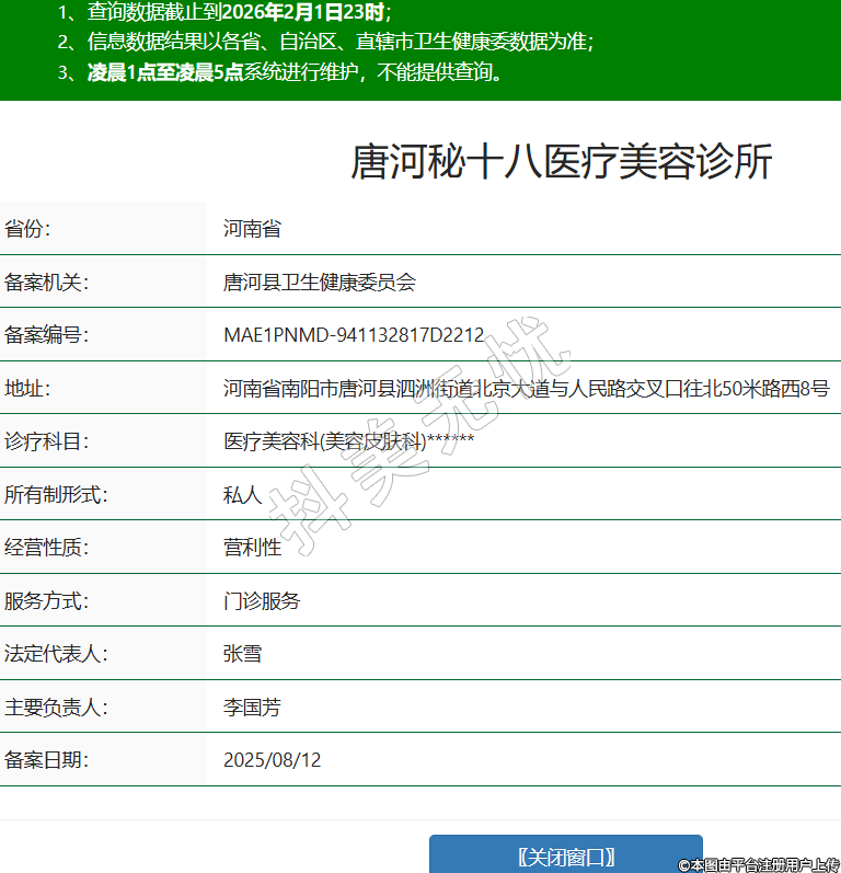 省份:河南省備案機關:唐河縣衛(wèi)生健康委員會備案編號:MAE1PNMD-941132817D2212地址:河南省南陽市唐河縣泗洲街道北京大道與人民路交叉口往北50米路西8號診療科目:醫(yī)療美容科(美容皮膚科)******所有制形式:私人經營性質:營利性服務方式:門診服務法定代表人:張雪主要負責人:李國芳備案日期:2025/08/12 -