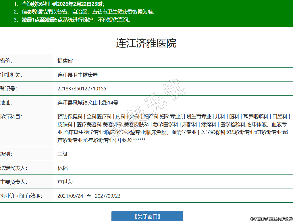 省份:福建省審批機關(guān):連江縣衛(wèi)生健康局登記號:221837350122710155地址:連江縣鳳城鎮(zhèn)文山北路14號診療科目:預(yù)防保健科 | 全科醫(yī)療科 | 內(nèi)科 | 外科 | 婦產(chǎn)科;婦科專業(yè);計劃生育專業(yè) | 兒科 | 眼科 | 耳鼻咽喉科 | 口腔科 | 皮膚科 | 醫(yī)療美容科;美容外科;美容皮膚科 | 急診醫(yī)學科 | 麻醉科 | 疼痛科 | 醫(yī)學檢驗科;臨床體液、血液專業(yè);臨床微生物學專業(yè);臨床化學檢驗專業(yè);臨床免疫、血清學專業(yè) | 醫(yī)學影像科;X線診斷專業(yè);CT診斷專業(yè);超聲診斷專業(yè);心電診斷專業(yè) | 中醫(yī)科******級別:二級法定代表人:林韜主要負責人:章世榮執(zhí)業(yè)許可證有效期:2021/09/24 -至- 2027/09/23 -