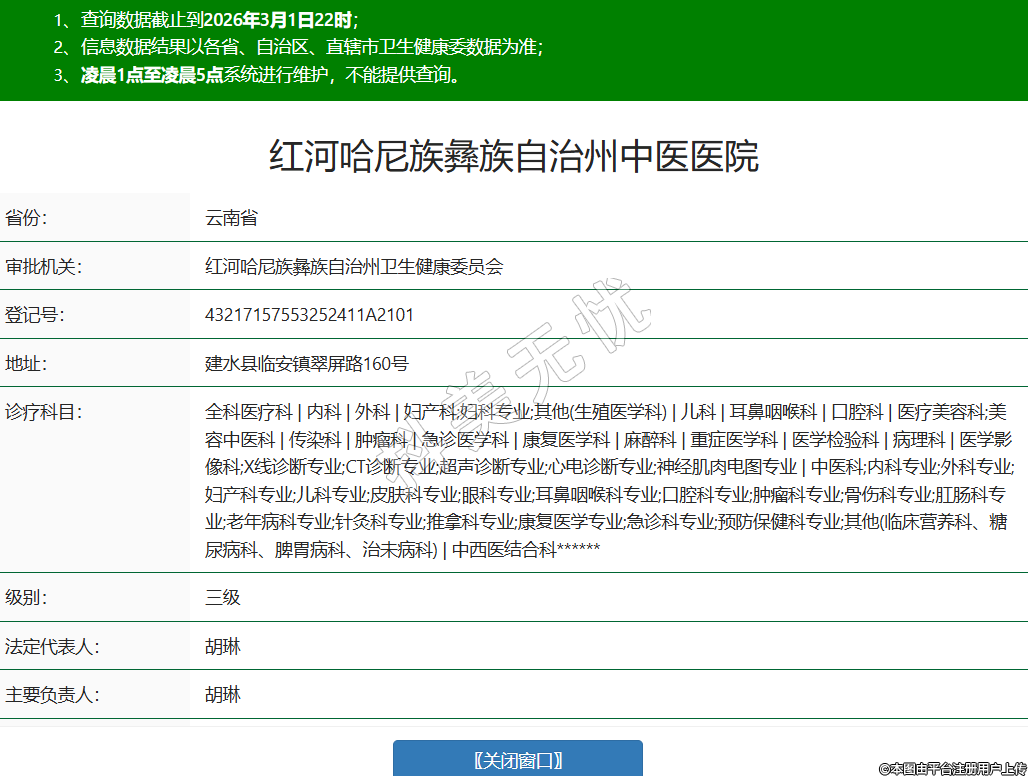 省份:云南省審批機(jī)關(guān):紅河哈尼族彝族自治州衛(wèi)生健康委員會登記號:43217157553252411A2101地址:建水縣臨安鎮(zhèn)翠屏路160號診療科目:全科醫(yī)療科 | 內(nèi)科 | 外科 | 婦產(chǎn)科;婦科專業(yè);其他(生殖醫(yī)學(xué)科) | 兒科 | 耳鼻咽喉科 | 口腔科 | 醫(yī)療美容科;美容中醫(yī)科 | 傳染科 | 腫瘤科 | 急診醫(yī)學(xué)科 | 康復(fù)醫(yī)學(xué)科 | 麻醉科 | 重癥醫(yī)學(xué)科 | 醫(yī)學(xué)檢驗科 | 病理科 | 醫(yī)學(xué)影像科;X線診斷專業(yè);CT診斷專業(yè);超聲診斷專業(yè);心電診斷專業(yè);神經(jīng)肌肉電圖專業(yè) | 中醫(yī)科;內(nèi)科專業(yè);外科專業(yè);婦產(chǎn)科專業(yè);兒科專業(yè);皮膚科專業(yè);眼科專業(yè);耳鼻咽喉科專業(yè);口腔科專業(yè);腫瘤科專業(yè);骨傷科專業(yè);肛腸科專業(yè);老年病科專業(yè);針灸科專業(yè);推拿科專業(yè);康復(fù)醫(yī)學(xué)專業(yè);急診科專業(yè);預(yù)防保健科專業(yè);其他(臨床營養(yǎng)科、糖尿病科、脾胃病科、治未病科) | 中西醫(yī)結(jié)合科******級別:三級法定代表人:胡琳主要負(fù)責(zé)人:胡琳執(zhí)業(yè)許可證有效期:2025/07/31 -至- 2038/09/21 -