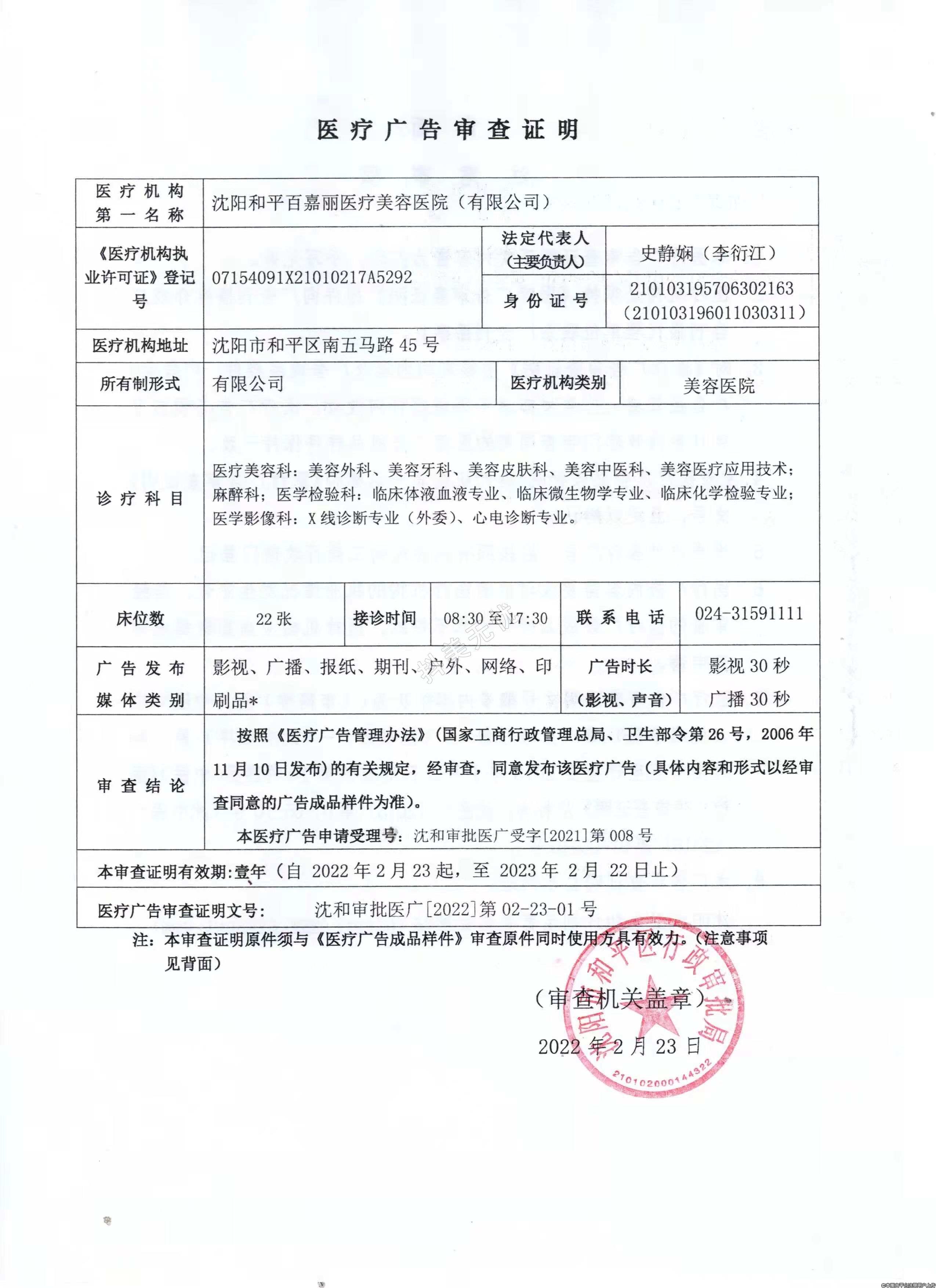 診療科目:醫(yī)療美容科(門診、住院、病床22張、牙椅2張);美容外科;美容牙科(牙椅2臺);美容皮膚科;美容中醫(yī)科;美容醫(yī)療應(yīng)用技術(shù)/麻醉科/醫(yī)學檢驗科、臨床體液、血液專業(yè);臨床微生物學專業(yè);臨床化學檢驗專業(yè)/醫(yī)學影像科、X線診斷專業(yè)(外委);心電診斷專業(yè)******