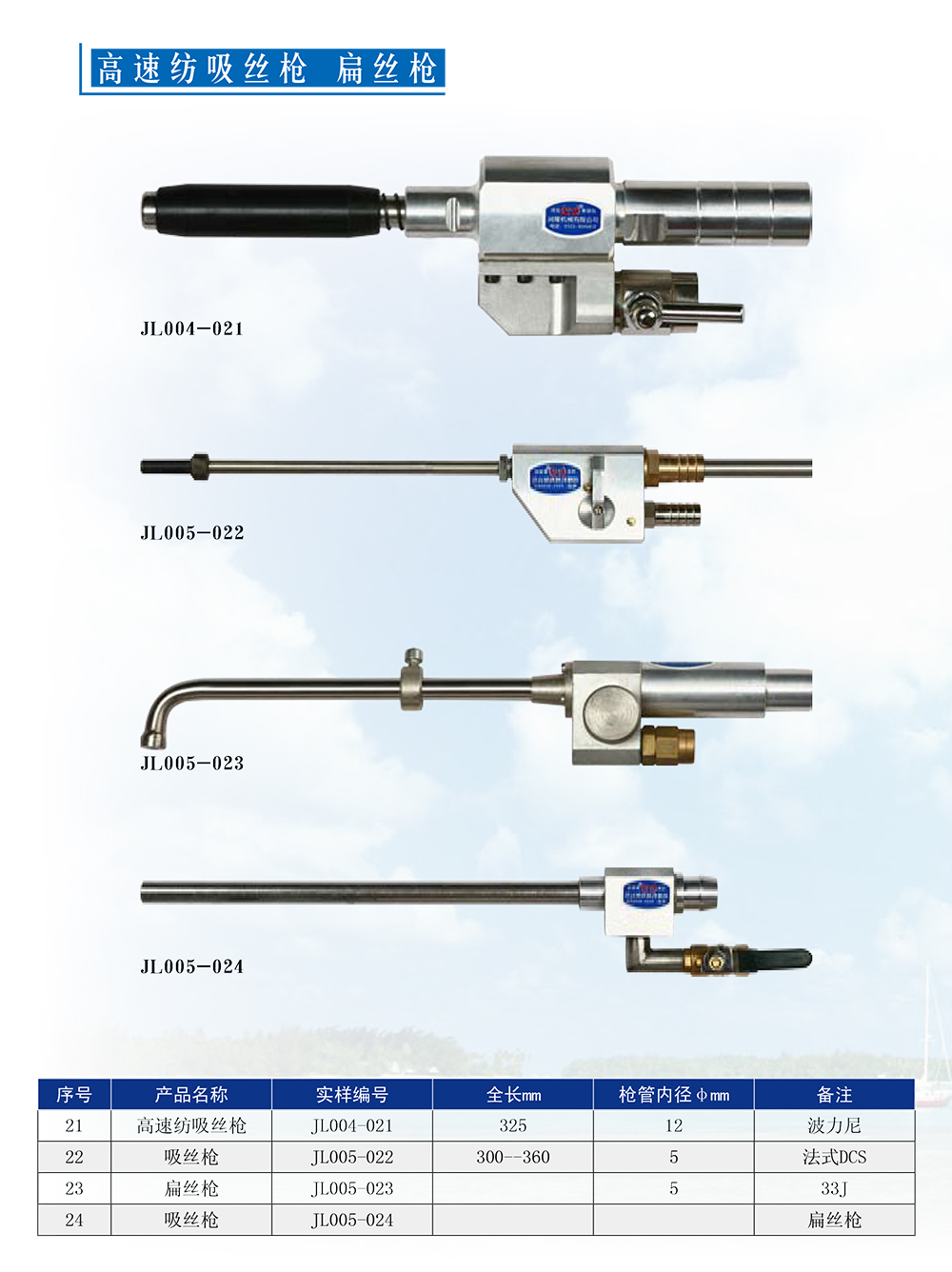 主營(yíng)各種系列吸絲槍和各種規(guī)格快速插座、升絲拉桿為主。吸絲槍主要包括高速紡FDY、 POY、短絲槍、工業(yè)絲槍,包括紡DTY、加彈機(jī)系列。來(lái)圖來(lái)樣生產(chǎn)。