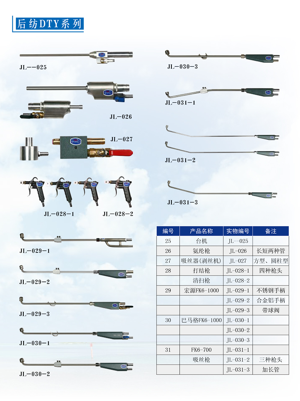主營各種系列吸絲槍和各種規(guī)格快速插座、升絲拉桿為主。吸絲槍主要包括高速紡FDY、 POY、短絲槍、工業(yè)絲槍,包括紡DTY、加彈機(jī)系列。來圖來樣生產(chǎn)。