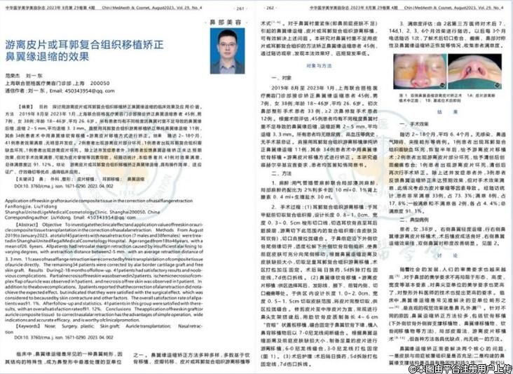 在2023年8月中旬,上海聯(lián)合麗格范榮杰院長(zhǎng)發(fā)表了題為《游離皮片或耳廓復(fù)合組織移植矯正鼻翼緣退縮的效果》的論文被中國(guó)臨床案例成果數(shù)據(jù)庫(kù) (CMCR)收錄并頒發(fā)了收錄證書(shū)。