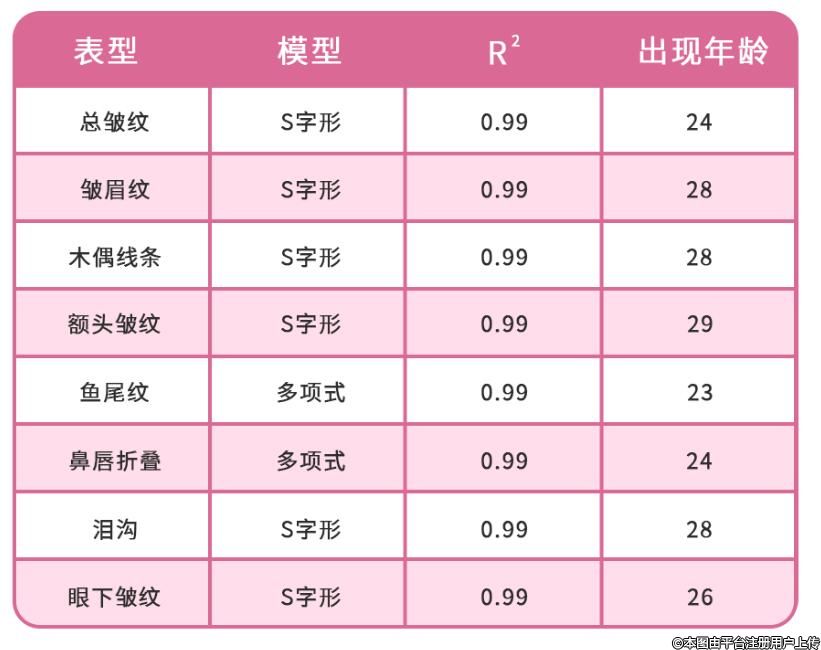 研究測試了臉部常見的7種皺紋,總皺紋的出現(xiàn)時間為24歲,其中與微笑表達相關的皺紋出現(xiàn)比較早,比如魚尾紋和法令紋。與憤怒或悲傷相關的皺紋,如皺眉紋、木偶紋往往發(fā)生在30歲左右。