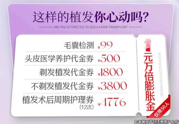 哇,搶了這個(gè)膨脹金植發(fā)好劃算啊,上次我去植發(fā)花了幾萬(wàn)塊錢,就是因?yàn)闆]有活動(dòng)才那么貴的,后面過(guò)幾天知道有活動(dòng)才后悔不已,早知道就不植發(fā)那么早了,花了那么多錢。