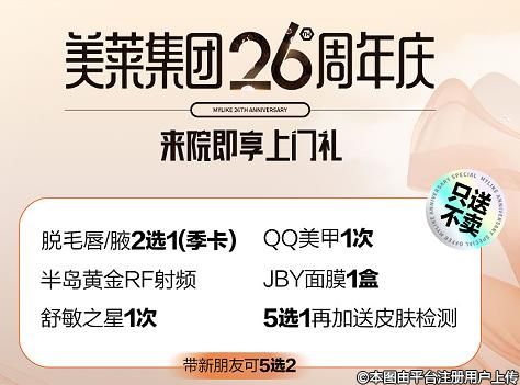 武漢美萊26周年慶優(yōu)惠福利來啦,帶朋友到院,即可享受美膚福利,五大福利可免費(fèi)選擇其中兩個(gè),你還在等什么呢。
