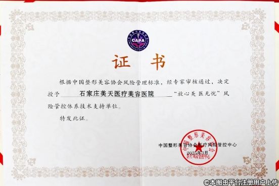 2025年3月,根據(jù)中國整形美容協(xié)會風(fēng)險管理標(biāo)準(zhǔn),經(jīng)專家審核通過,石家莊美天醫(yī)療美容醫(yī)院被授予“放心美 醫(yī)無憂”風(fēng)險管控體系技術(shù)支持單位。中國整形美容協(xié)會醫(yī)療風(fēng)險管控中心為石家莊美天發(fā)放證書。