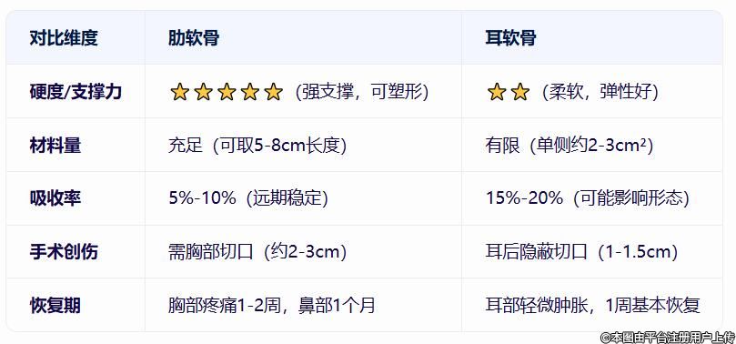 耳軟骨:單側取材易卷曲,需搭配“疊瓦狀縫合”技術;雙側取材可能導致耳廓支撐力下降。